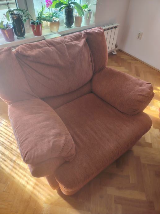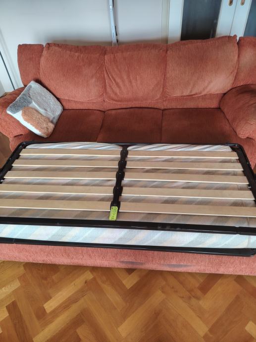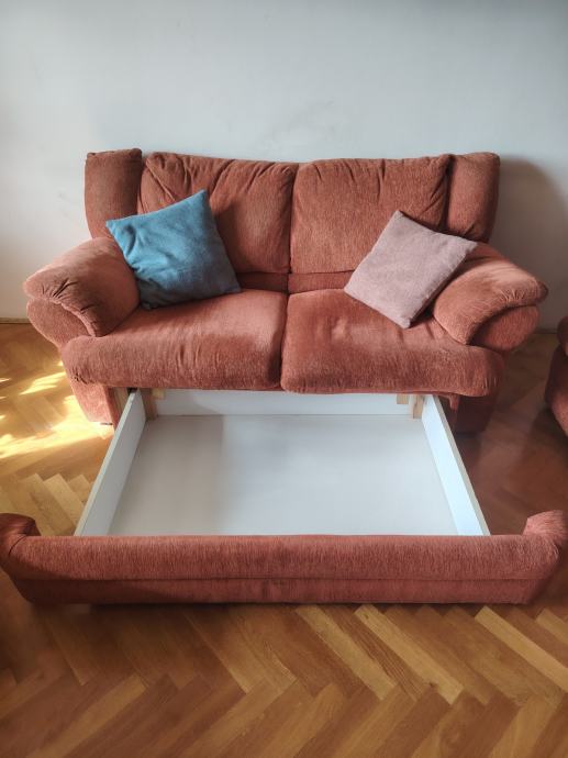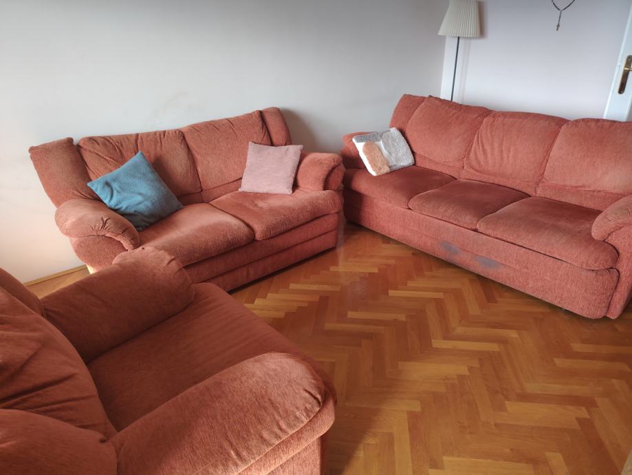 Poklanjam rabljenu garnituru ( trosjed s krevetom na razvlačenje, dvosjed s prostorom za odlaganje i fotelju). Trosjed je dužine 200 cm, dok je dvosjed 160 cm.
