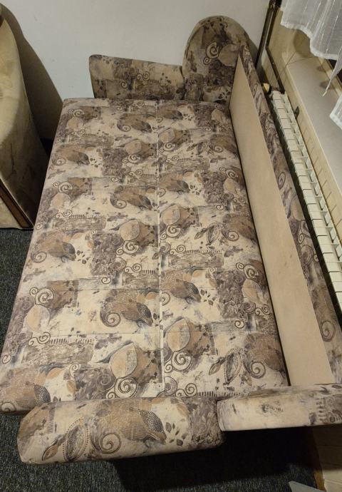 Prodajem rabljeni kauč na razvlačenje presvučen tkaninom s uzorkom u bež i smeđim tonovima. Kauč se razvlači u ležaj, što ga čini praktičnim za svakodnevno korištenje ili povremeno spavanje. Tkanina je s printom koji kombinira vintage motive u toplim, neutralnim nijansama.