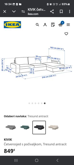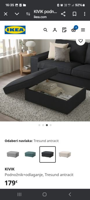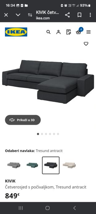 Prodajem Kivik četverosjed sa počivaljkom i tabureom, kupljen u Ikei. U dobrom stanju, sve navlake se skidaju i perive su, uz mogućnost kupnje novih navlaka u Ikeu u raznim bojama. Tabure je ujedno i spremnik.