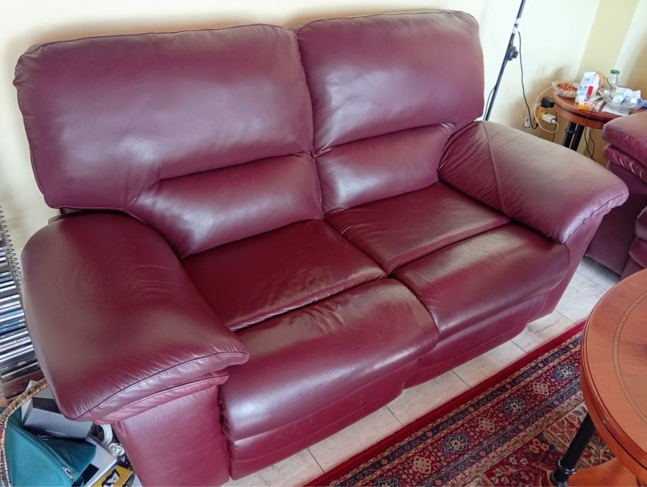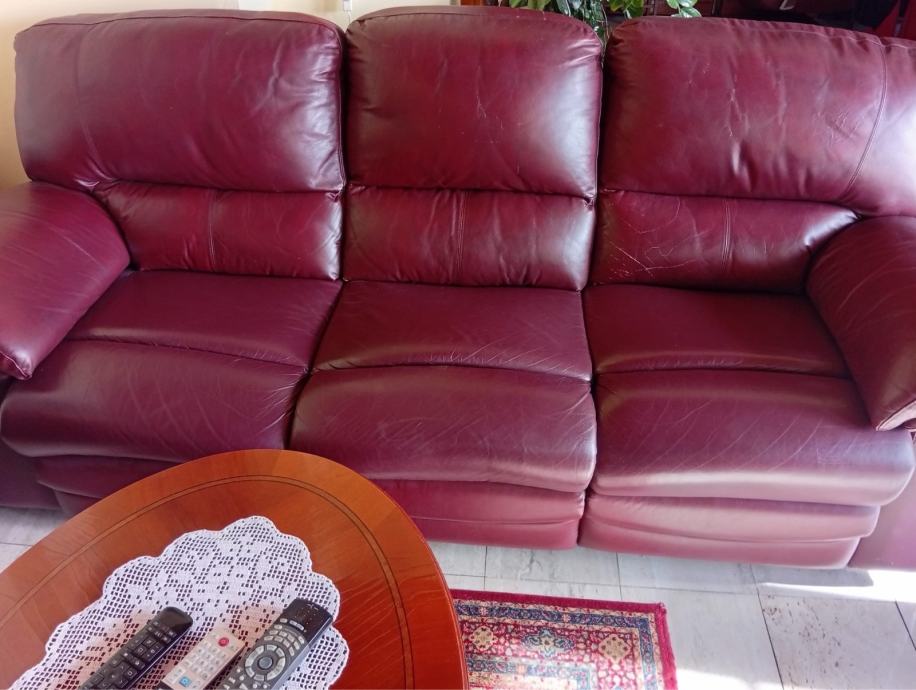 Komplet je od željezne konstrukcije završna presvlaka prirodna koža, vrlo očuvan. Trosjed, dvosjed i fotelja, prodaje se sve zajedno ili po dogovoru. Cijena po dogovoru, 091 4720 250, Veljko.