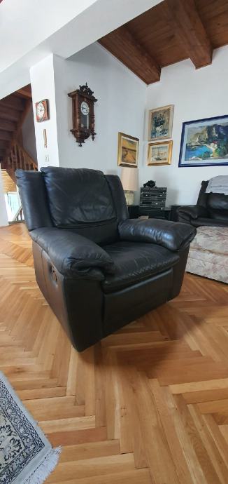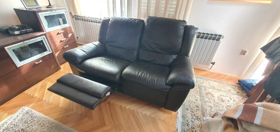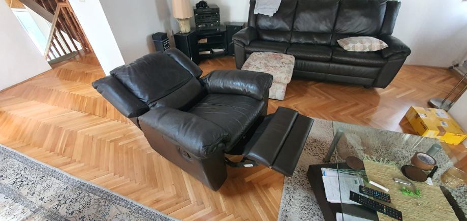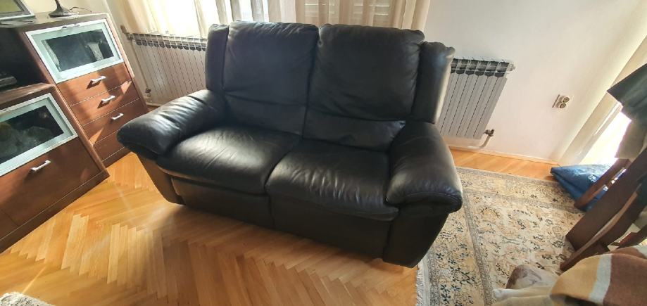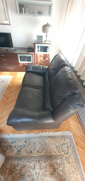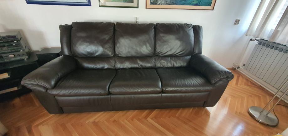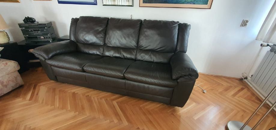 Prodaje se vrlo očuvana sjedeća garnitura od prave kože koja se sastoji od trosjeda, dvosjeda i fotelje.