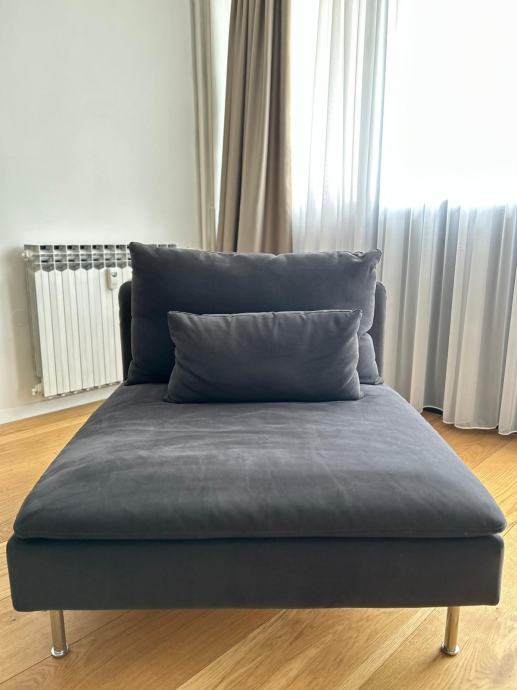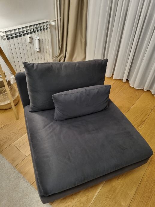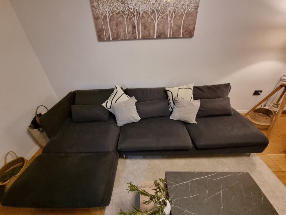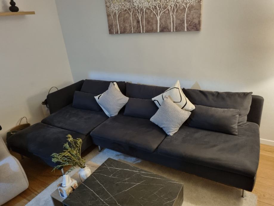 Prodajem modularnu sofu Soderhamn, kupljenu u Ikei. Komplet se sastoji od pocivaljke, trosjeda i fotelje koji se mogu odvojit i biti svaki zasebno, ili se moze spojiti sve skupa. Na fotelji se mogu dignuti nasloni te se pretvara u tabure, ili se moze spojiti na trosjed. Komplet je star 2 godine (garancija 10 godina), savrseno ocuvan, udoban te su navlake perive. Razlog prodaje je renovacija stana. Prednost je sto se moze rastavit u dijelove zbog lakseg transporta.