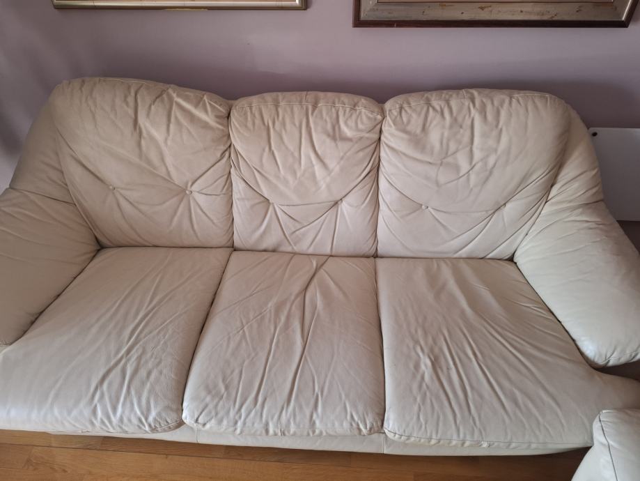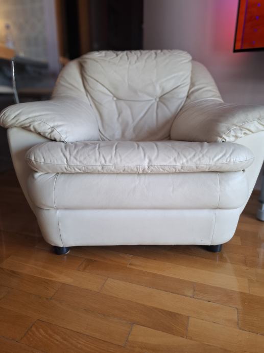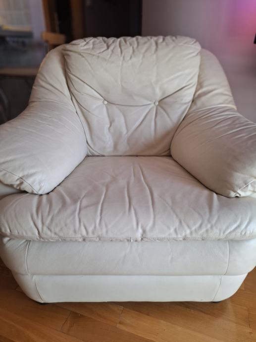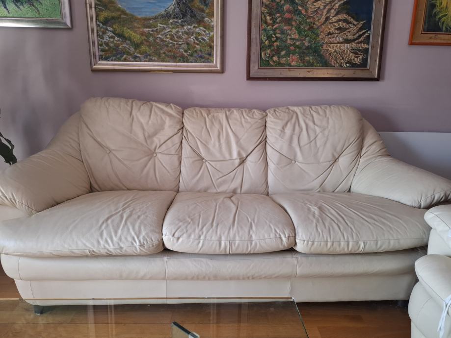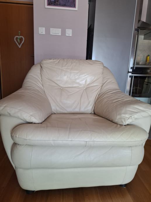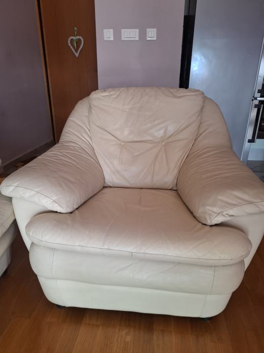 Prodaje se korištena sjedeća garnitura od prave kože u očuvanom stanju. Sastoji se od trosjeda koji može biti i ležaj te dvije fotelje. Boja je bež. Nalazi se u Zadru u stambenoj zgradi. Kupac organizira prijevoz o vlastitom trošku.