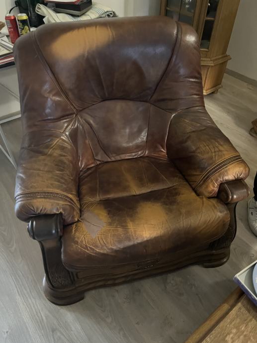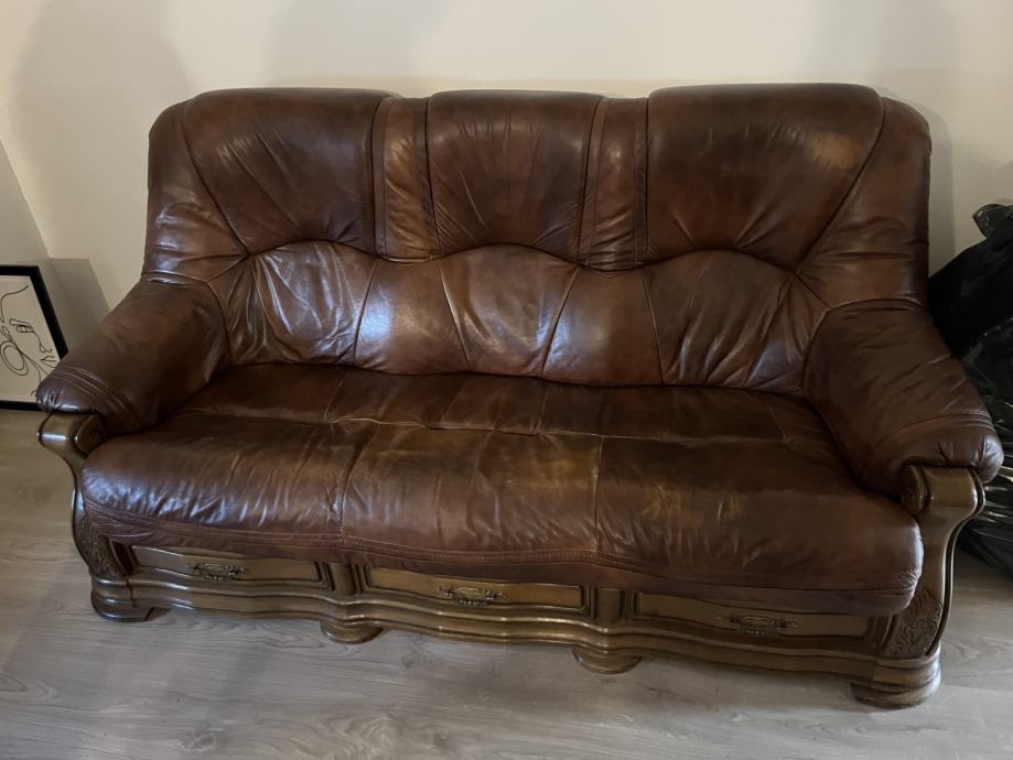 Garnitura za dnevni boravak od masivnog punog drveta i janjeće kože. Dobro očuvano. Prodaje se u kompletu trosjed, dvosjed i fotelja.