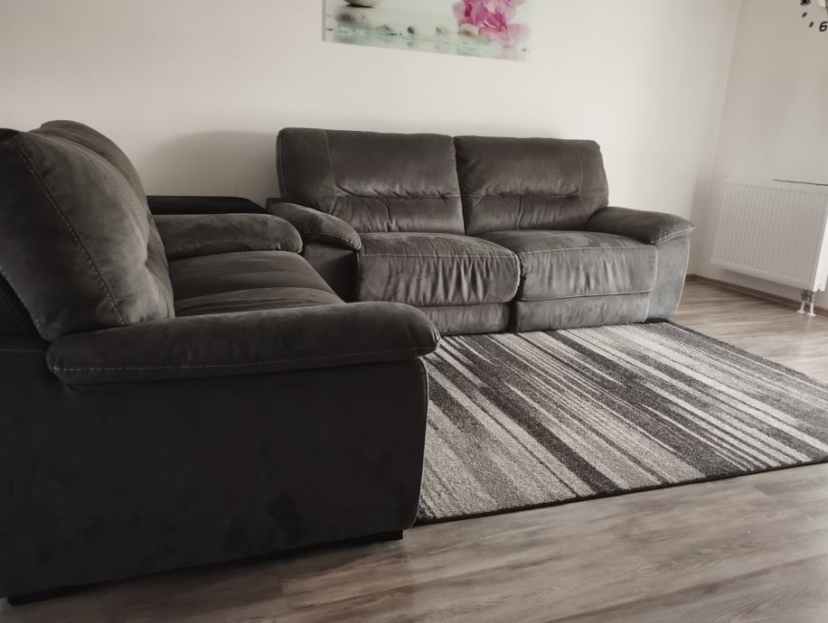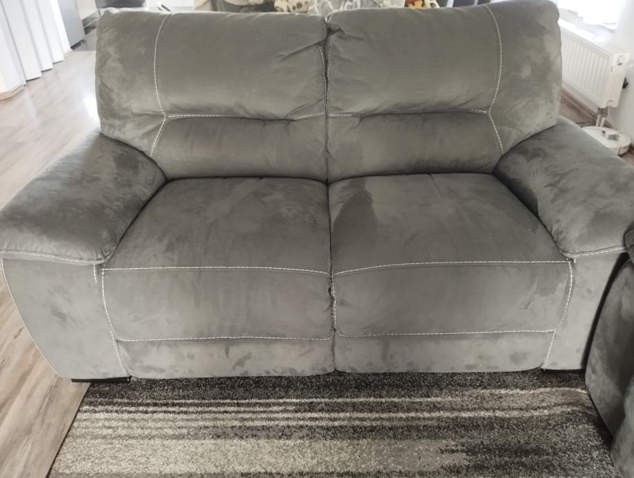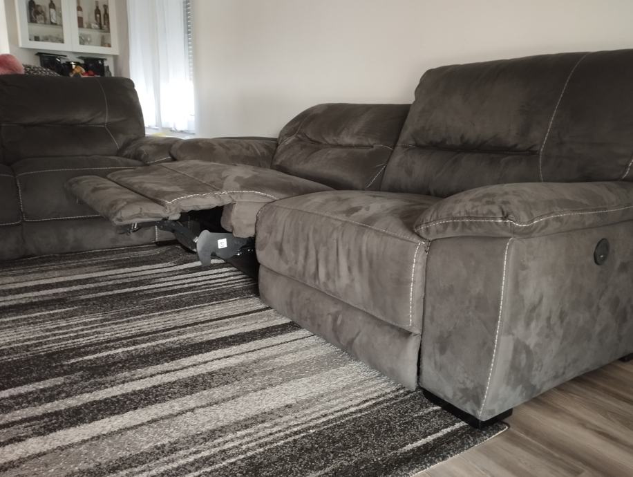 Trosjed i dvosjed kratko korišteno,očuvano,bez ijednog oštećenja. Relax funkcija na struju na trosjedu. Uvijek prekriveni dekama, brušena koža tamno sive boje koja se lako prebriše sa vlažnom krpom,jednostavno održavanje.