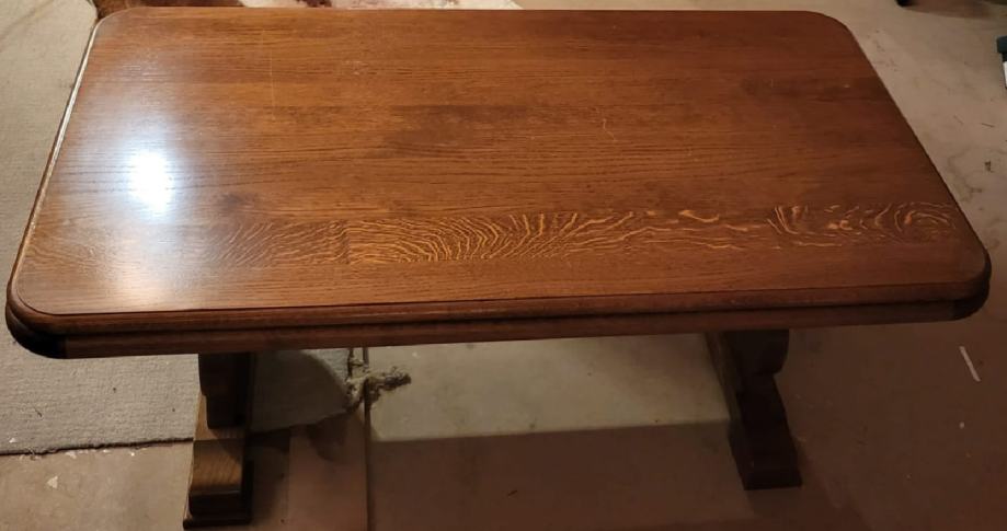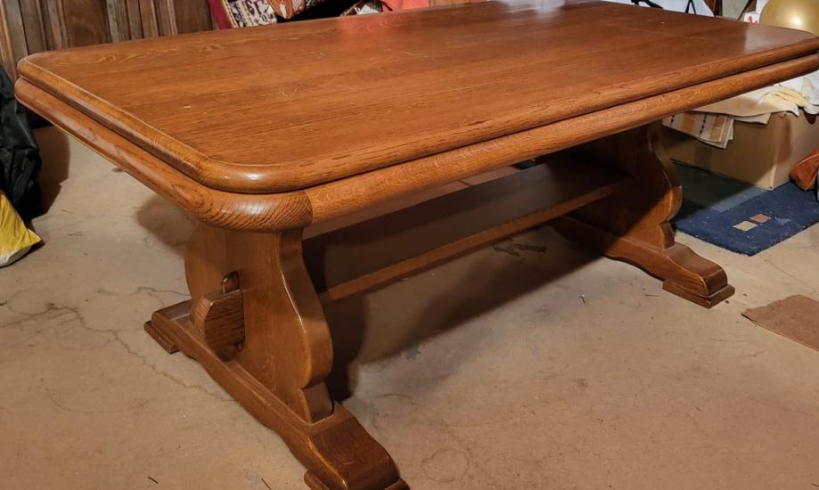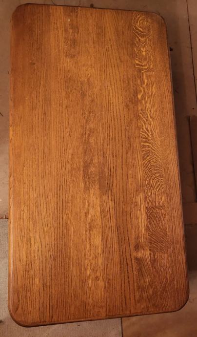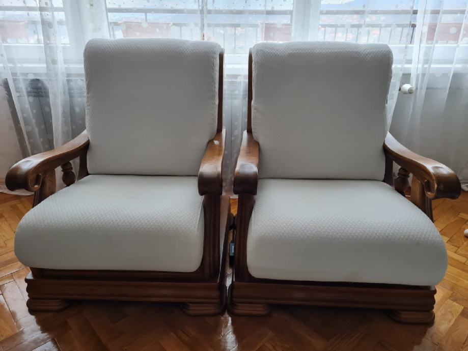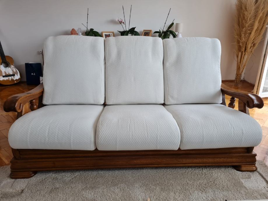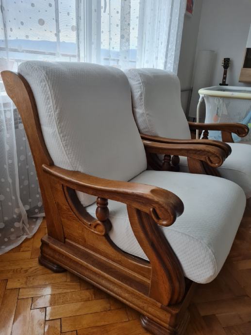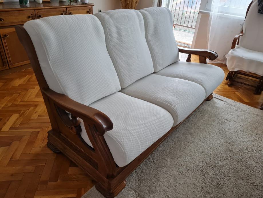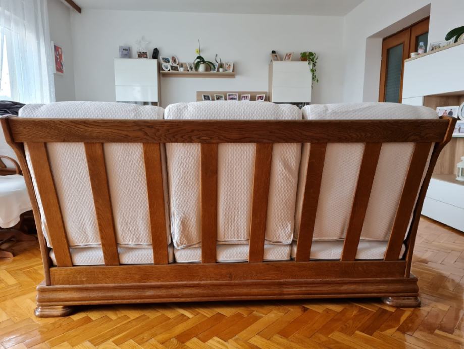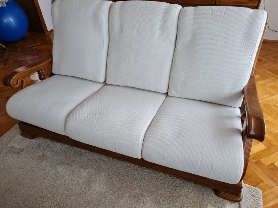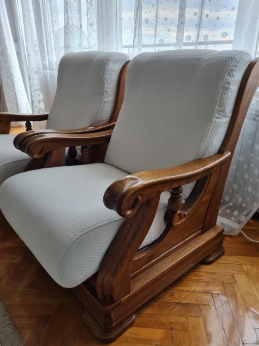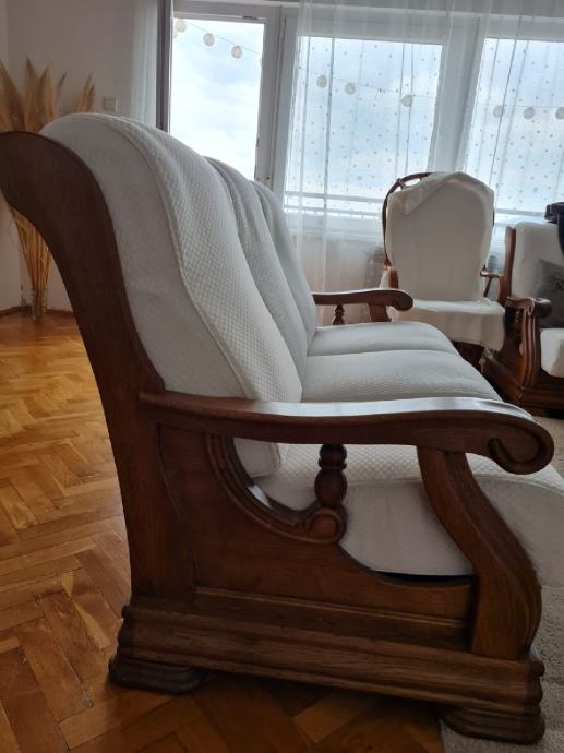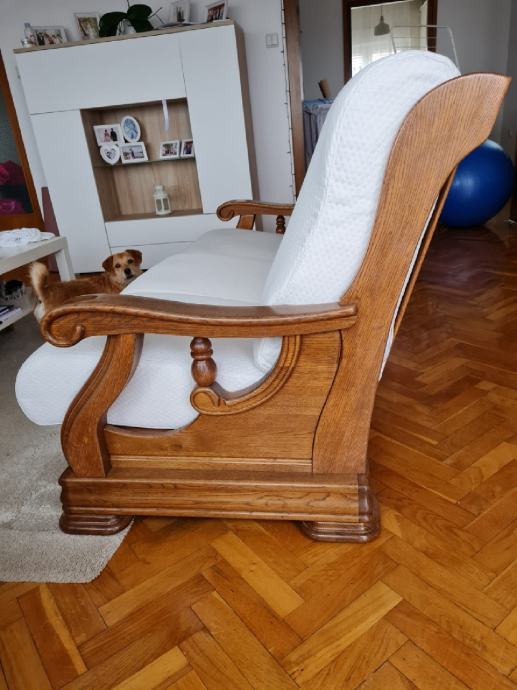 Izvrsno očuvana garnitura od hrast masiva, trosjed (v 87 × š 173 × d 70 cm) , dvije fotelje ( v 87 × š 70 × d 70 cm), kožni jastuci presvučeni kvalitetnim bijelim navlakama na zip (da se mogu skinut i oprat) te pripadajući stolić također od hrast masiva (v 52 × š130 × d70 cm)