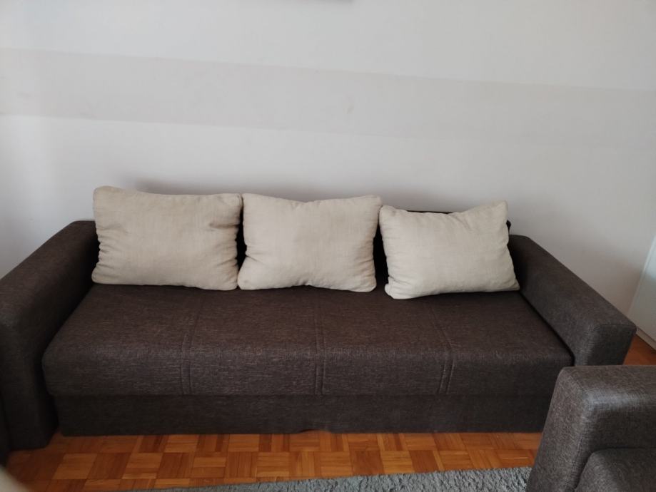 Trosjed u smeđoj boji sa tri krem jastuka. Razvlaći se u ležaj.Ima kutiju za spremanje posteljine.