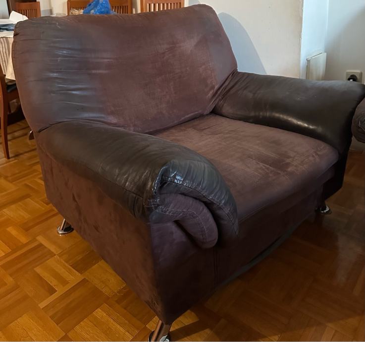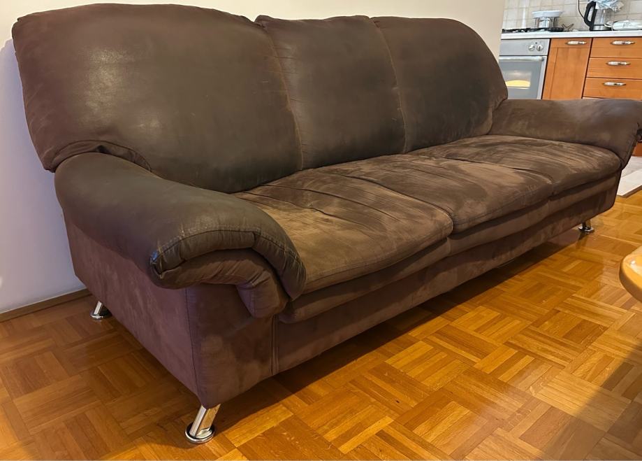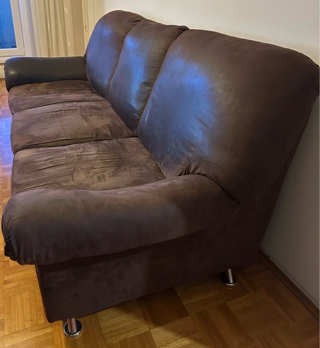 Poklanjam sjedeću garnituru u smeđoj boji. Garnitura ima metalnu noge i presvlaku od tkanine. Sastoji se od trosjeda, dvosjeda i fotelje. Staro cca 10 godina.