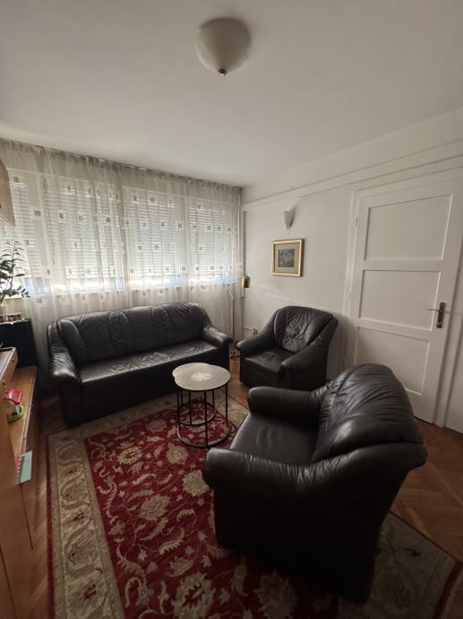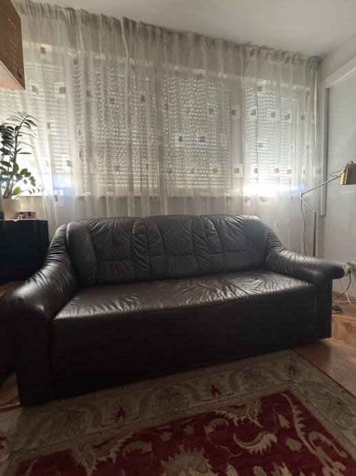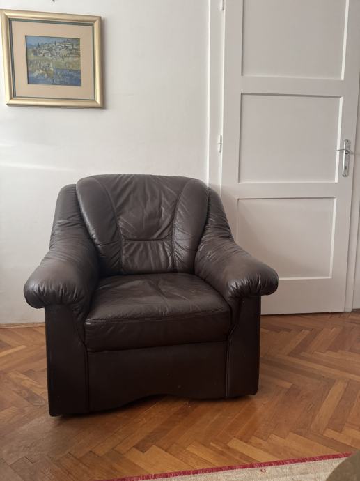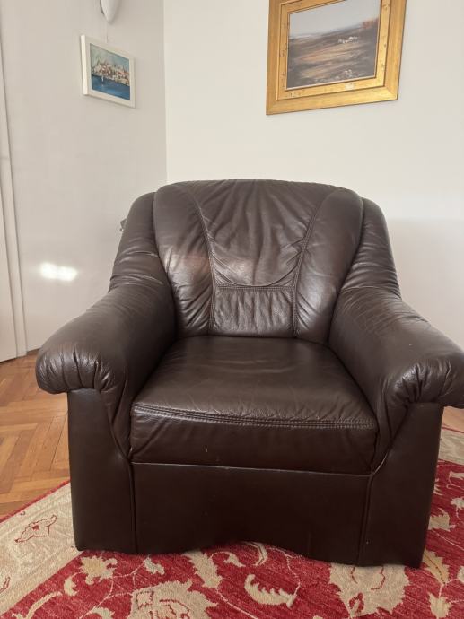 Sjedeća kožna garnitura, smeđe boje, trosjed i dvije fotelje. Sve u izvrsnom stanju.