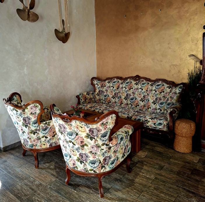 Prodaje se prekrasan stilski trosjed, dvije fotelje i stolic . Platno uredno, nije uništeno. Drvo zdravo, bez oštećenja, pukotina.