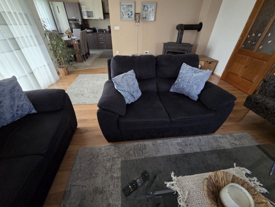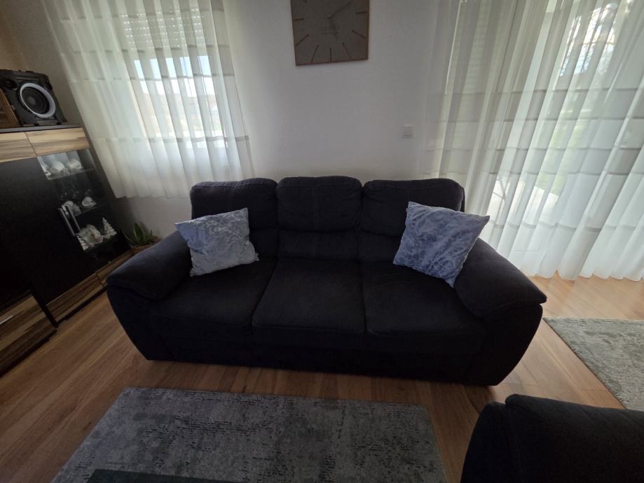 Kao na slikama, na prodaju komplet garnitura za dnevni boravak, trosjed (mogućnost razvlačenja u ležaj), dvosjed sa ladicom za garderobu, dvije fotelje, stolic za dnevni boravak kao na slikama