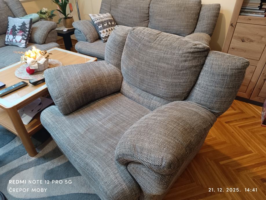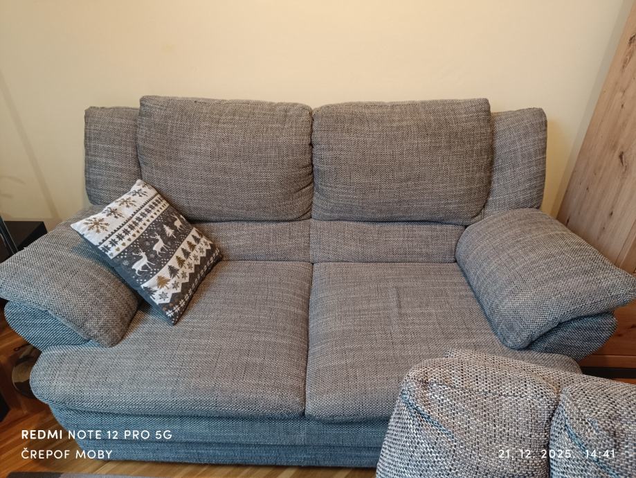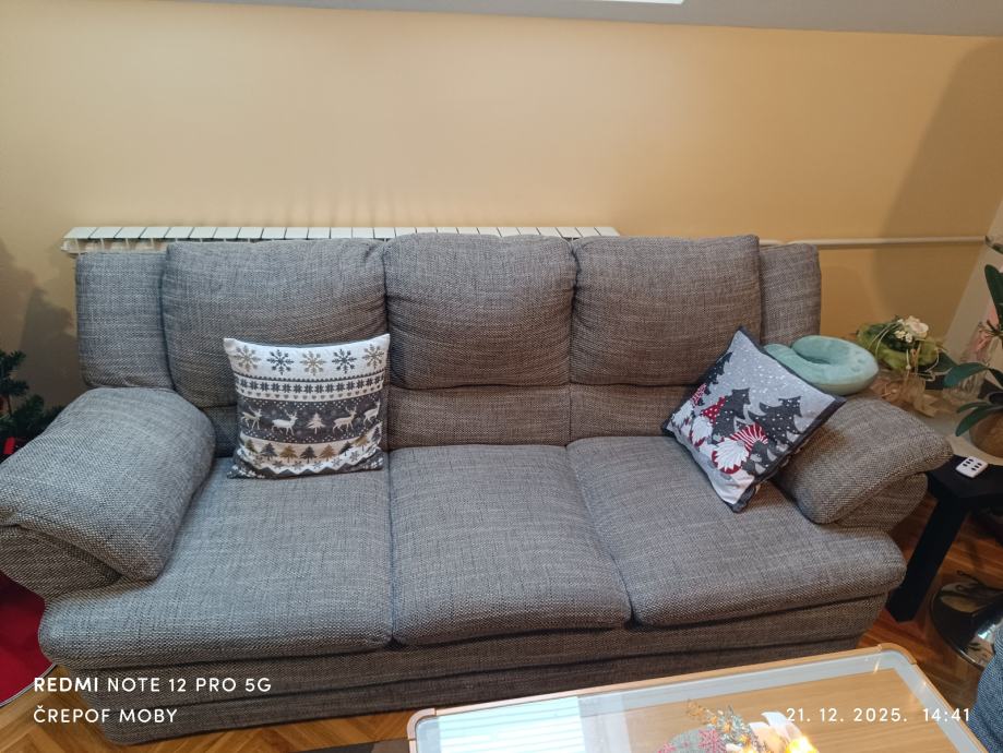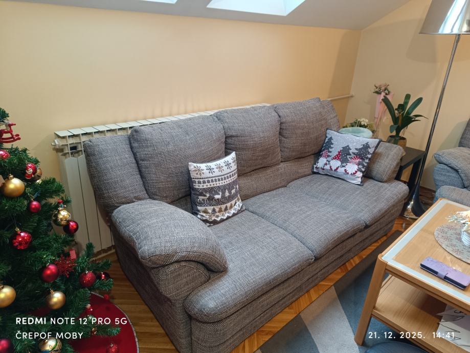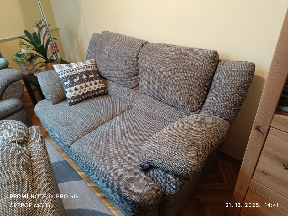 Prodajem urednu i očuvanu sjedeću garnituru. Dimenzije (š,v,d) za trosjed 200*80*90, dvosjed 170*80*90, fotelja 100*80*90.