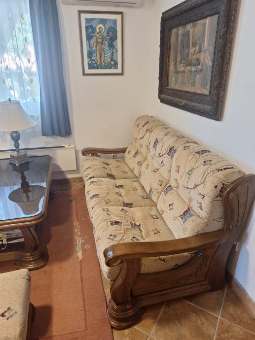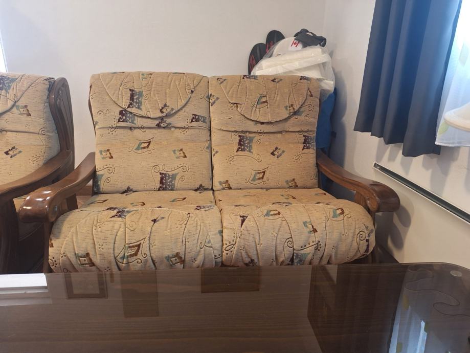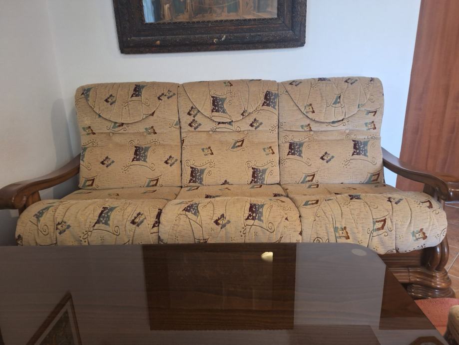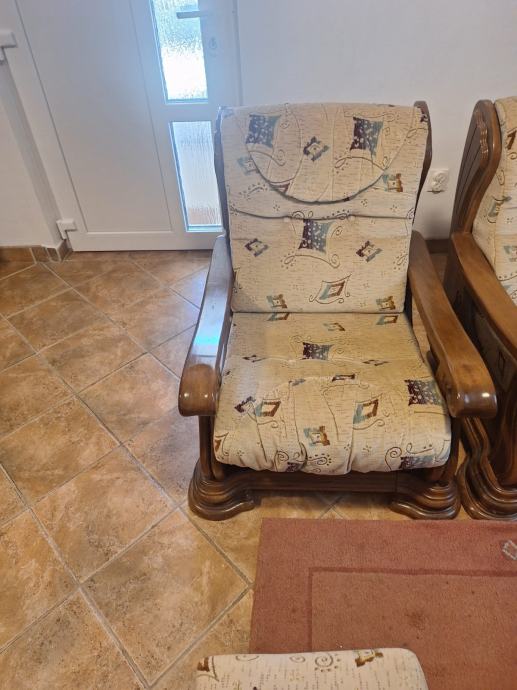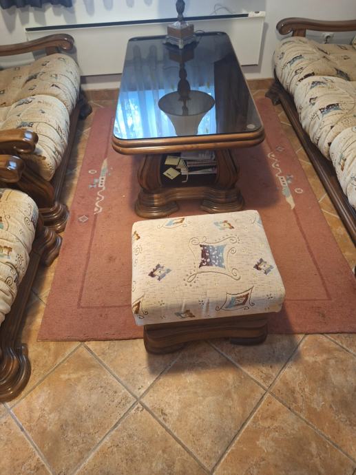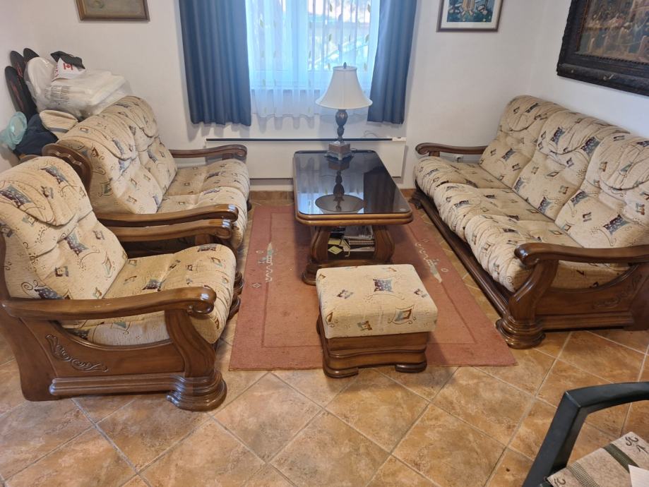 Prodajem komplet trosjed, dvosjed, fotelja, tabure, stol. Masivno drvo, ručni rad.