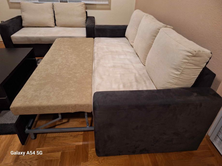 Prodajem koristen, dobro ocuvan trosjed na razvlacenje,dvosjed i tabure. Dvosjed ima kutiju za posteljinu.