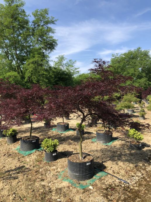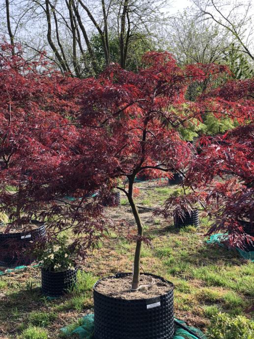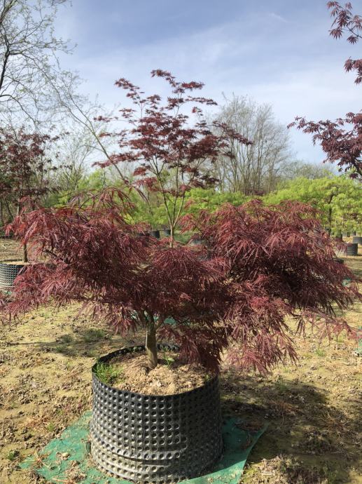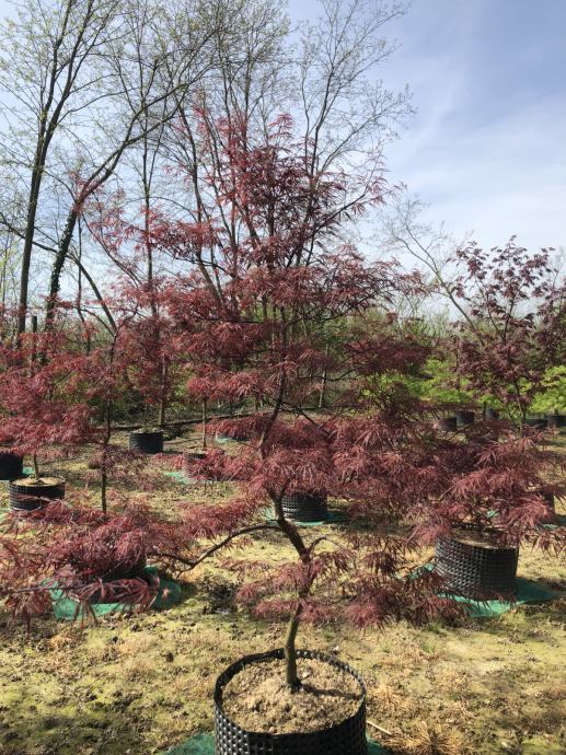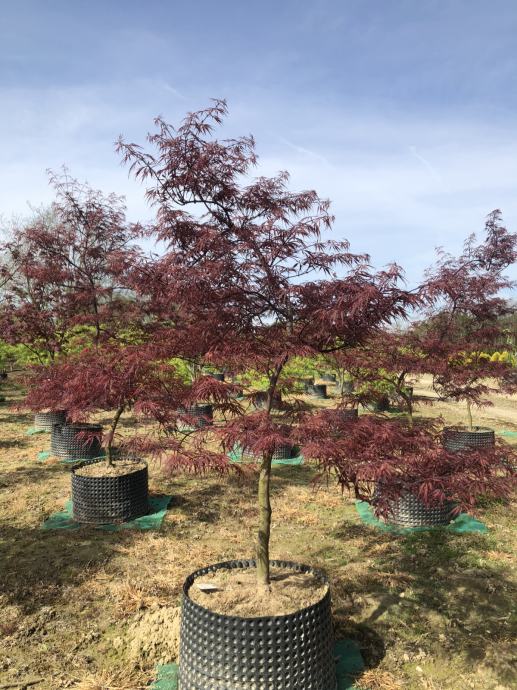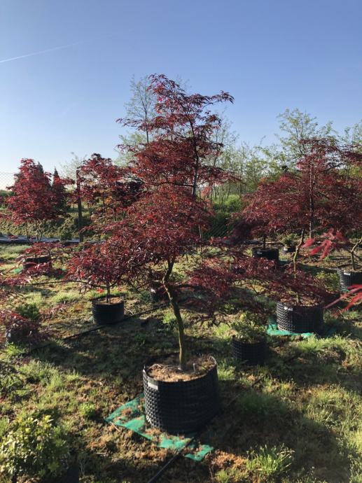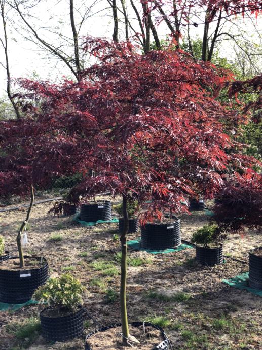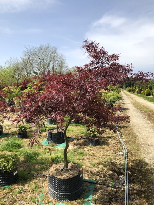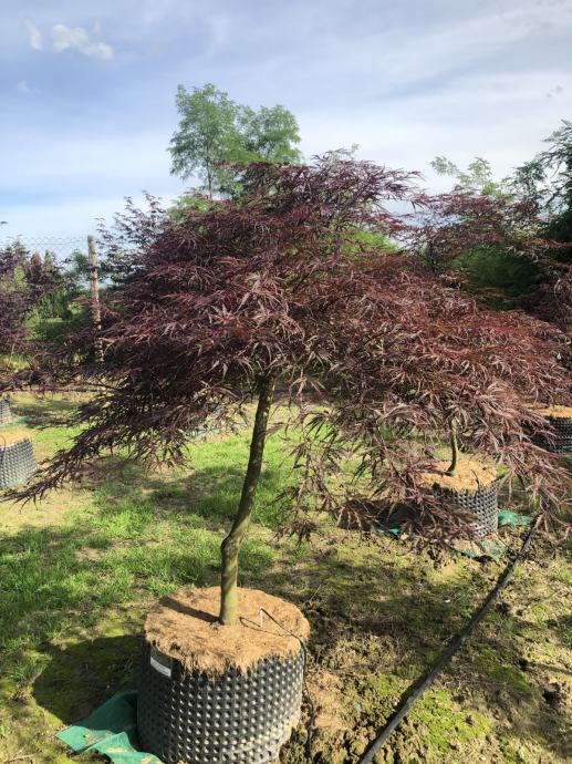 OPIS: Ovo je patuljasti, dobro razgranati japanski javor širokog habitusa sa snažnim i povijenim kaskadnim granama. Čipkasto lišće crveno je tijekom proljeća, ljeta i jeseni. Zimi se elegantno uvijene grane posebno ističu tijekom jutarnjih mrazeva, s injem ili snijegom na njima. Ovaj japanski javor je prekrasan izbor za terase, japanske i gradske vrtove. Vrlo je otporan na nepovoljne zimske uvjete. Snažnog je rasta, za 10 godina bez orezivanja postiže visinu i širinu cca 2-3 m. Ljubitelj je punog sunca ili polusijene, vlažnog, organski bogatog, blago kiselog i dobro dreniranog tla. Traži malo održavanja, ako jako potjera poželjno je lagano orezivanje nakon intenzivnog porasta da bi se zadržala željena veličina i oblik. Jače orezivanje obavite u jesen ili zimu, izbjegavajte orezivanje u proljeće kada curi sok.