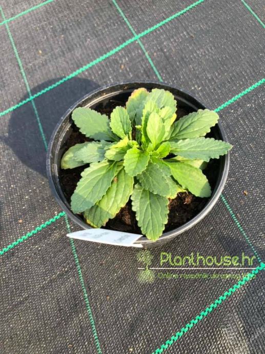 Cvjetovi pazušni, skupljeni u klas, čaška dlakava s 5 lapova, cvjetni vjenčić tubast s dvije usne od kojih donja ima 4 resice i velika je.