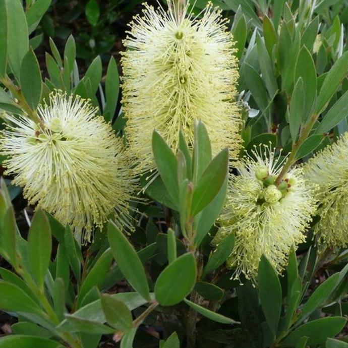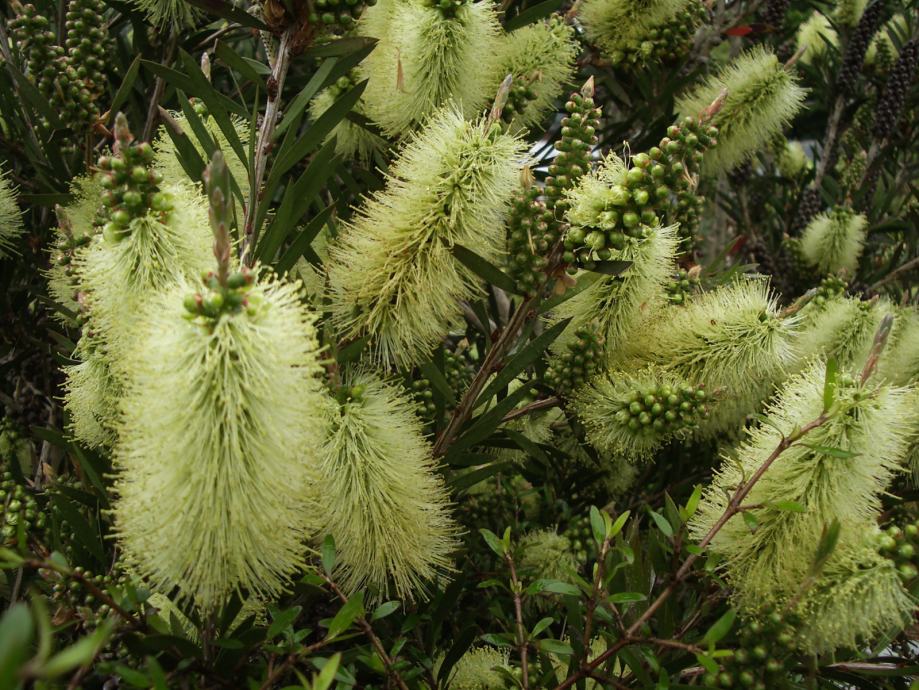 Cvijet je crvene boje, s dugačkim prašnicima, gusto zbijeni u veliki cvat u obliku četke