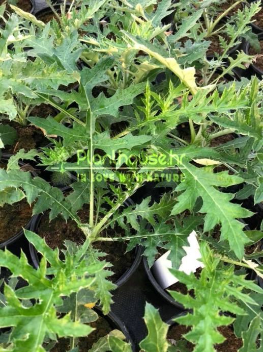 Ima bodljikavo sivozeleno lišće između koga izrastaju duge krute stabljike na završetku kojih su kugle promjera do 4 cm. Cvjeta od 7. do 9. mjeseca.