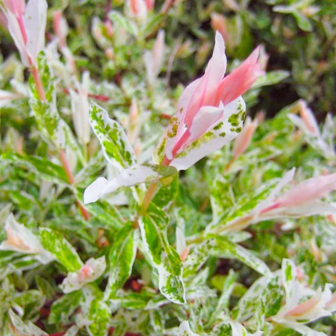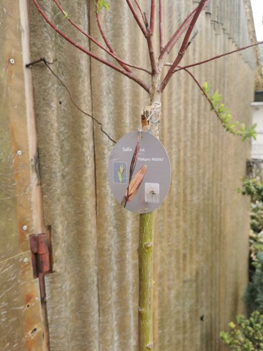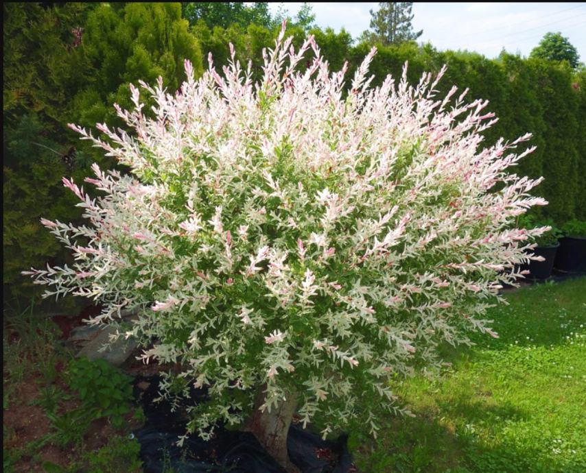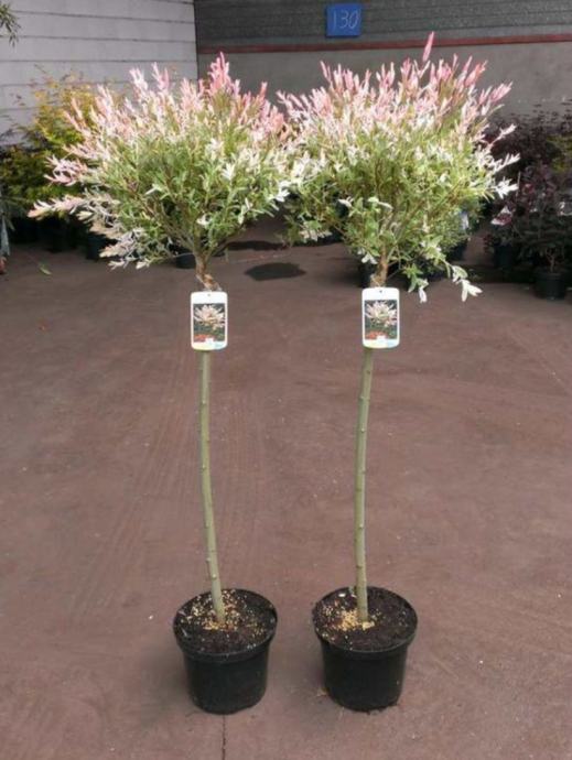 Bijelo zelena vrba , pravilnog kuglastog oblika sa mladim izbojima roze boje.