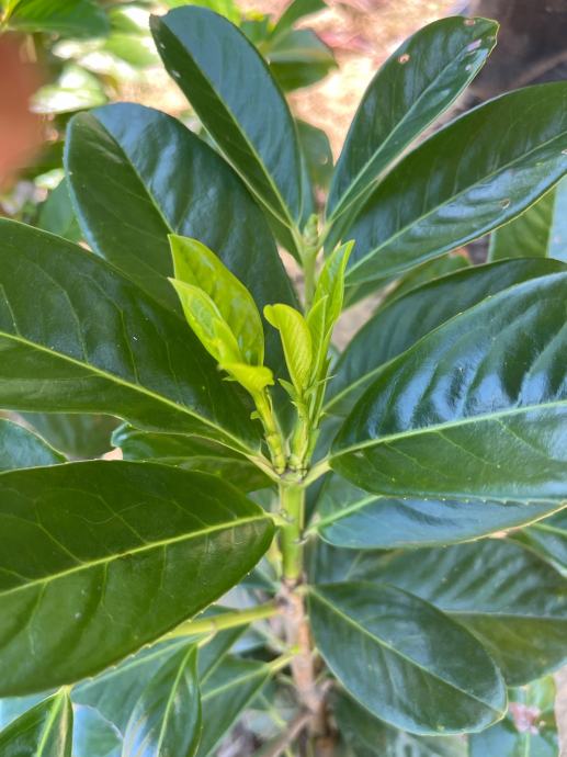 Formira gust, uspravan, zimzeleni grm s velikim, duguljastim, sjajnim, tamnozelenim listovima.