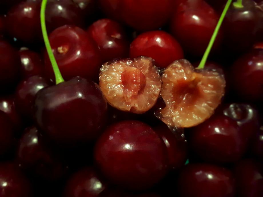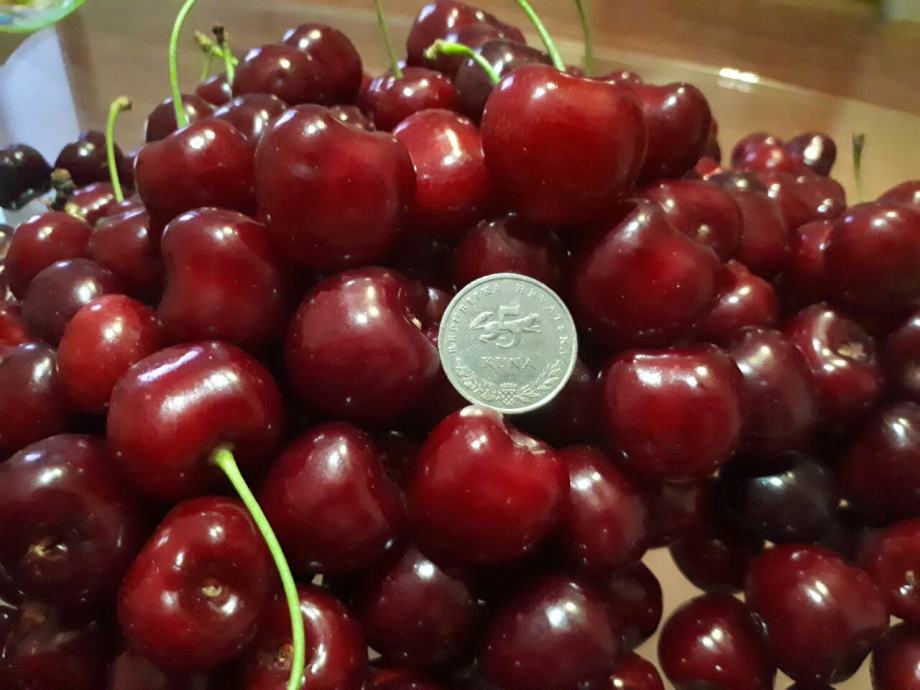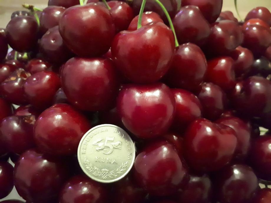 Plodovi su izazito krupni tamnocrvene boje i blago srcolika oblika.