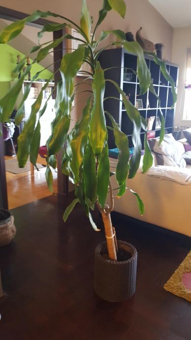 Sobna biljka DRACENA (drvo), prekrasnih listova, visine cca 165 - 170 cm, u pletenoj posudi tamnosmeđe boje.