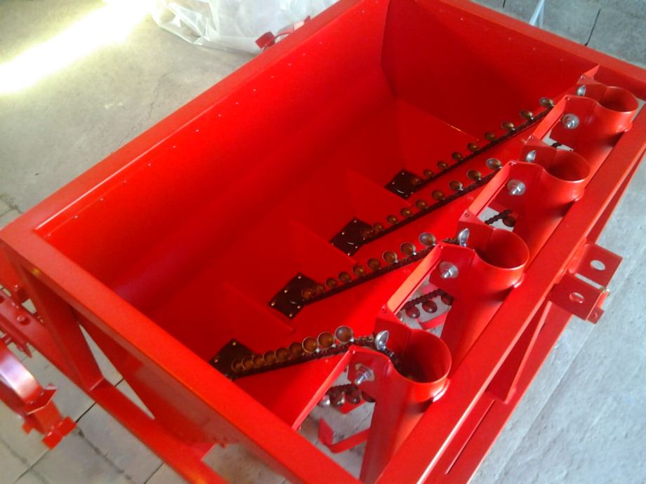mehanizam za izbacivanje semena arpadžika i belog luka je beskrajni lanac sa kofama koja dobijaju pogon od točkova sejalice preko setvenih osovina