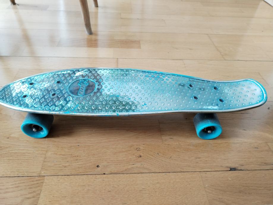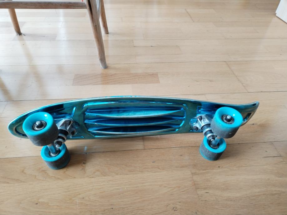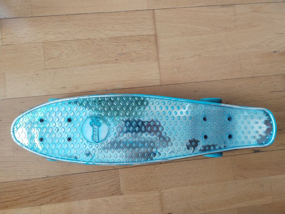 Skateboard - pennyboard 43cm, nosivost 60kg plastična osovina, plavi kotači, korišten jedno ljeto. Poklanjam