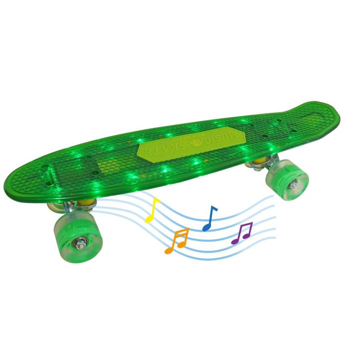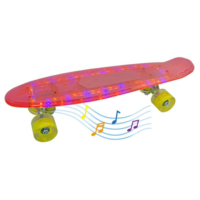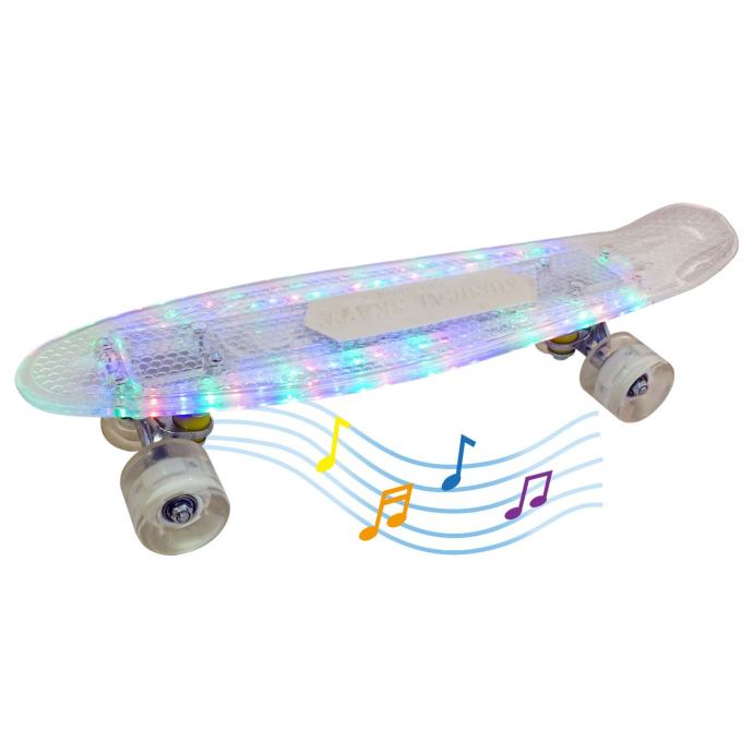 Ovaj skateboard objedinjuje 3u1 funkciju: glazba, LED svjetlo i bluetooth. Veliki čvrsti silikonski kotači omogućuju dobre vozne osobine kao i meko prelaženje preko neravnina. Čvrsta aluminijska osovina, daska iz robusne plastike s protukliznom površinom jamče stabilan stav i mirnu vožnju. Zanimljiv transparentni dizajn upotpunjuje cjelokupni dojam.