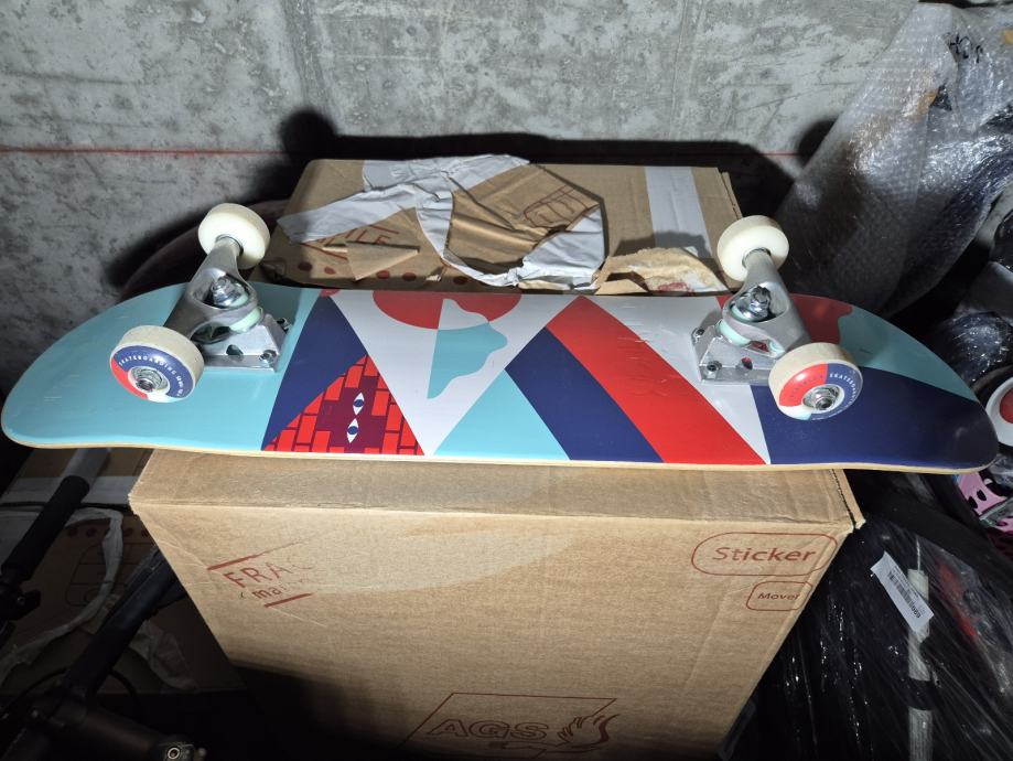 Prodajem Decathlon skateboard model CP 100, veličine 7'6, namijenjen djeci od 8 do 12 godina. Skateboard ima šareni dizajn s geometrijskim uzorcima u plavoj, crvenoj i bijeloj boji. Opremljen je kvalitetnim kotačima i osovinama, pogodan za učenje osnovnih skateboard vještina i vožnju. Novo stanje - koristi se 1 sat...