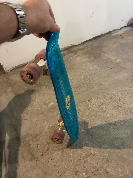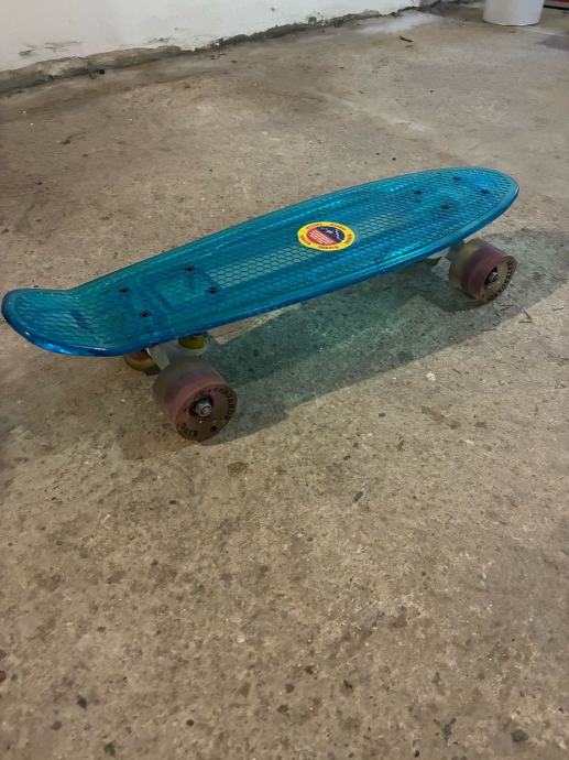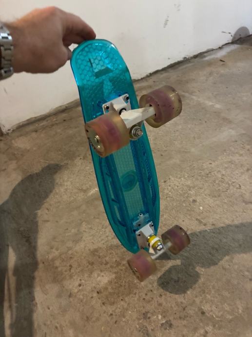 Prodajem Skateboard plave boje, prozirni, čvrsta plastika. Ima silikonske kotače koji svjetle prilikom vožnje. Dimenzije: