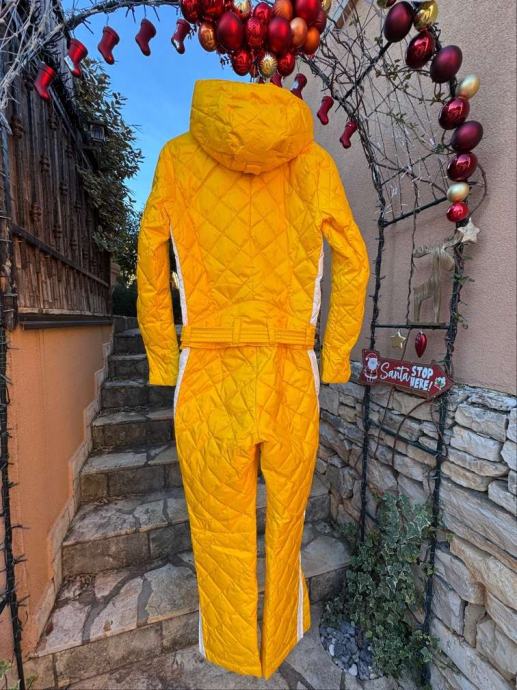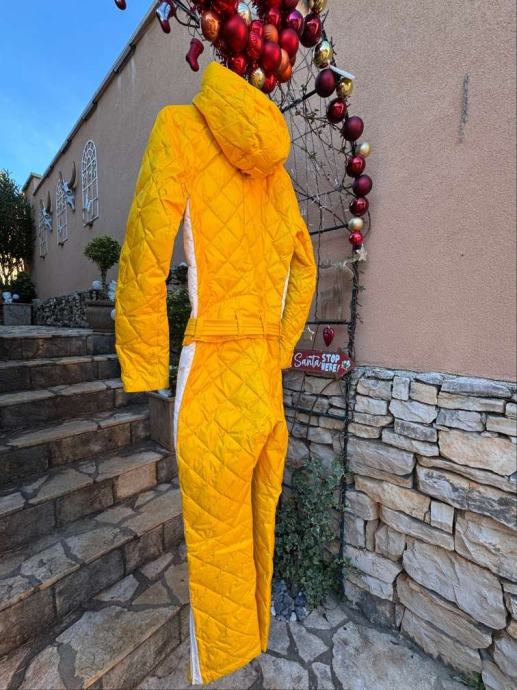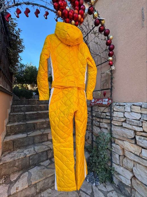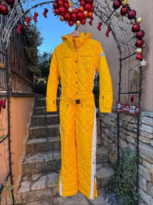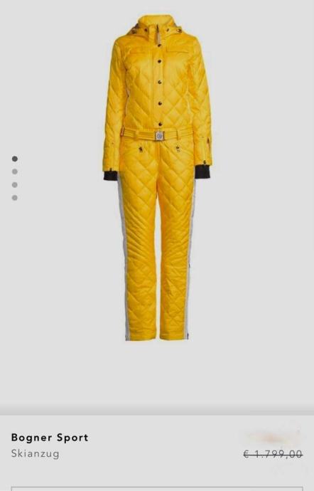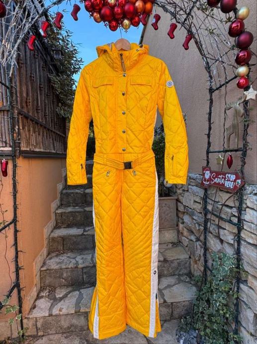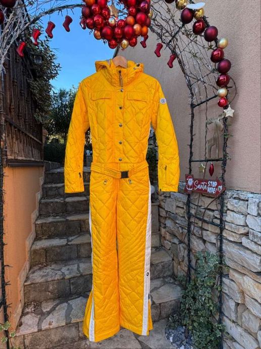 Žuto, prošiveno skijaško odijelo s remenom, model Greta marke Bogner, opremljeno je modernom tehnologijom za vrhunske performanse na stazama.