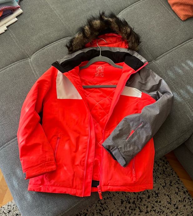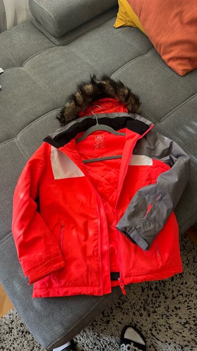 Jakna je crveno narancaste boje s sivim detaljima i ima toplo krzno na kapuljači. Kvalitetna je i savršena za zimske sportske aktivnosti.