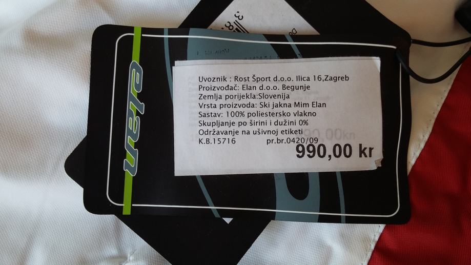 Nova, nekorištena ski jakna Elan. Broj 58. Još su uvijek etikete i cijena na njoj. Plaćena 990 kn, prodajem za 600 kn.