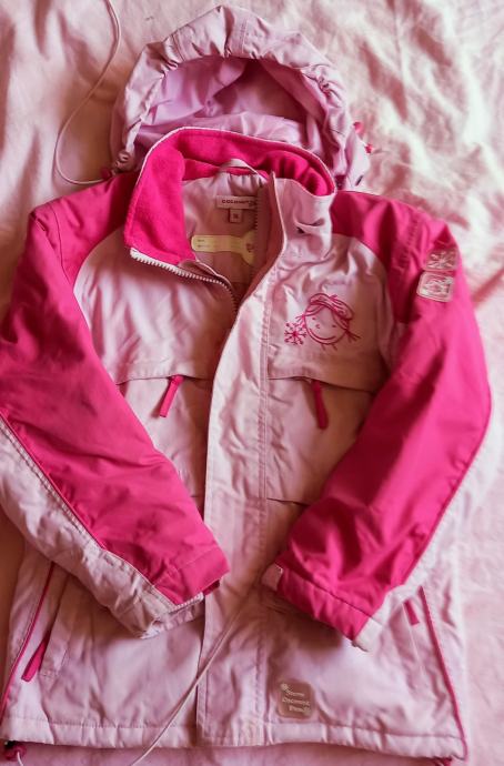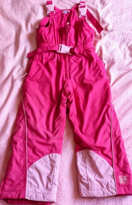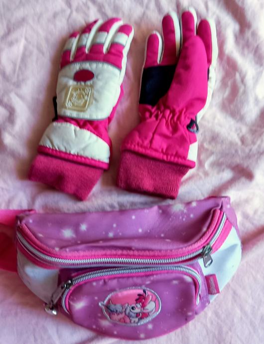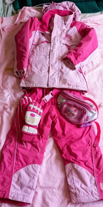 Prodajem rabljeni skijaški komplet za djevojčice u kombinaciji svijetlo i tamno roze boje. Komplet se sastoji od tople jakne s ukrasnim detaljima pahuljica i hlača s pojačanjima na koljenima. Uključene su i skijaške rukavice te pojasna torbica, idealno za male skijašice.