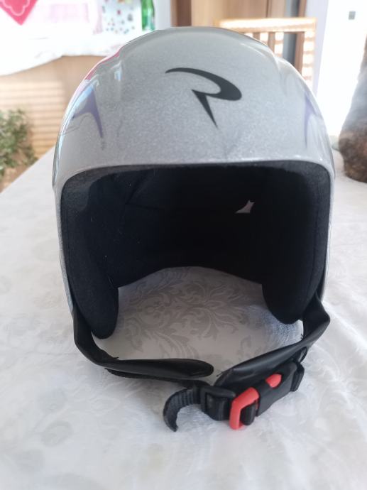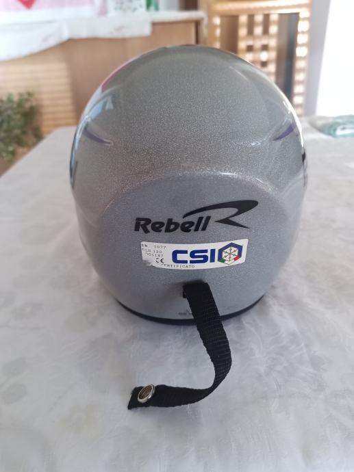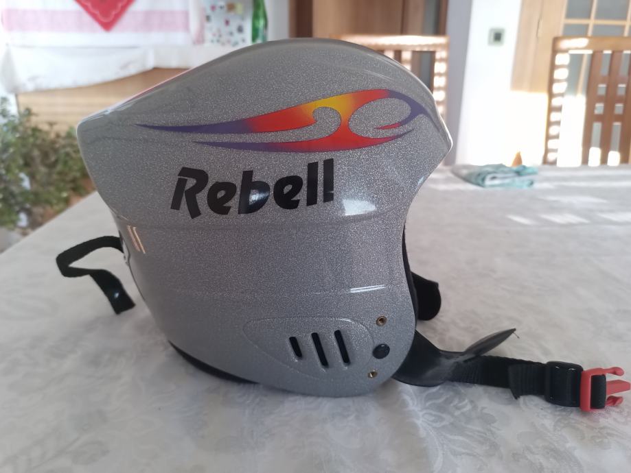 Dječja ski-kaciga, marka Rebell, korištena. Ima malu poderotinu u unutrašnjosti, inače u vrlo dobrom stanju. Za opseg glave 56.