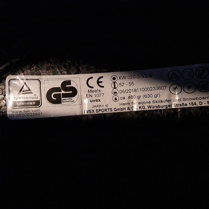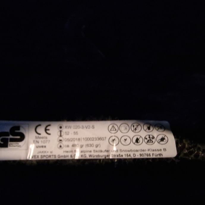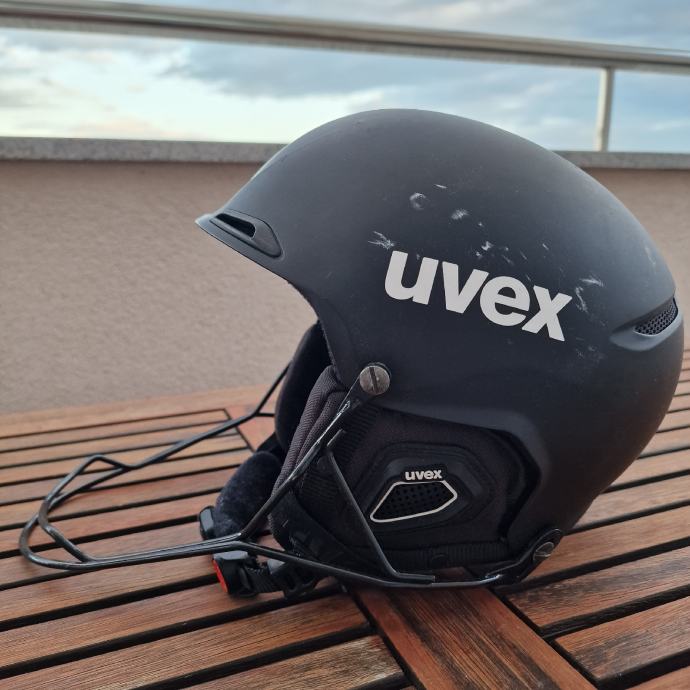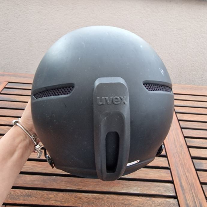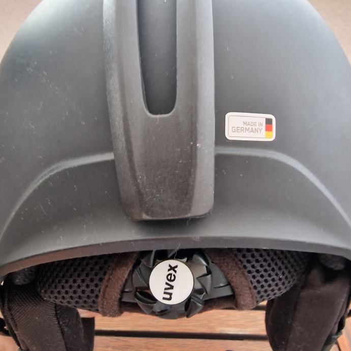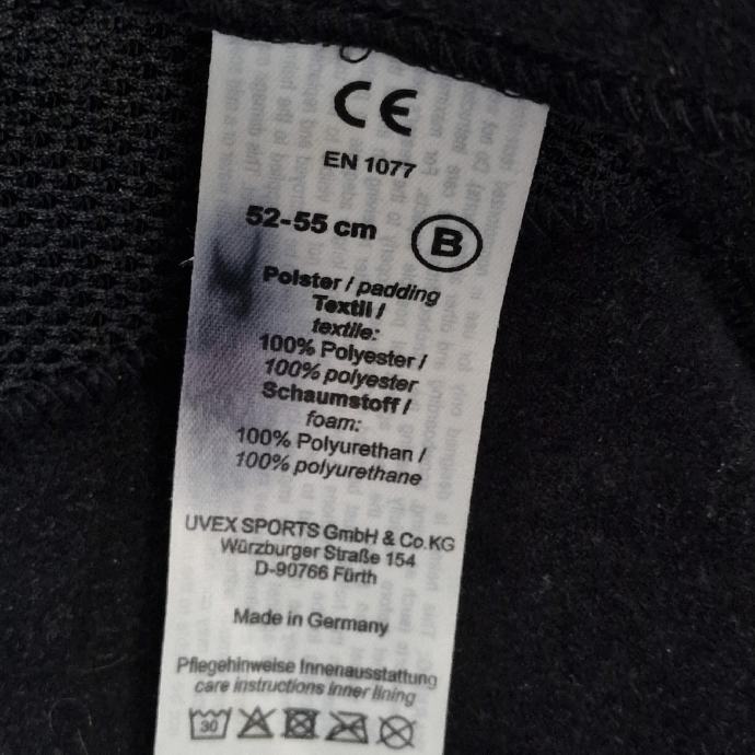 Uvex kaciga za alpsko skijanje, s certifikatom za natjecanja. Velicina 52-55 cm, otraga vijak za podesavanje velicine, odvojiva brnjica.