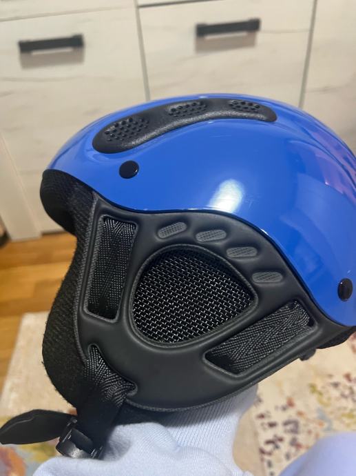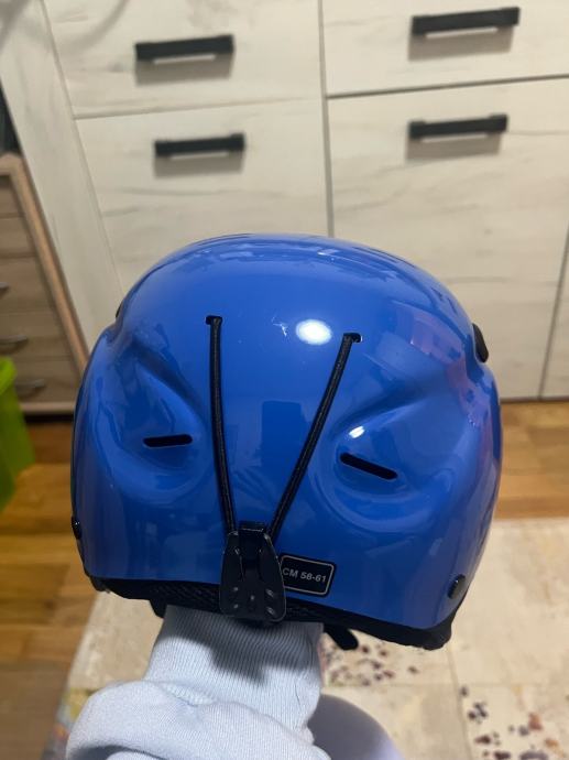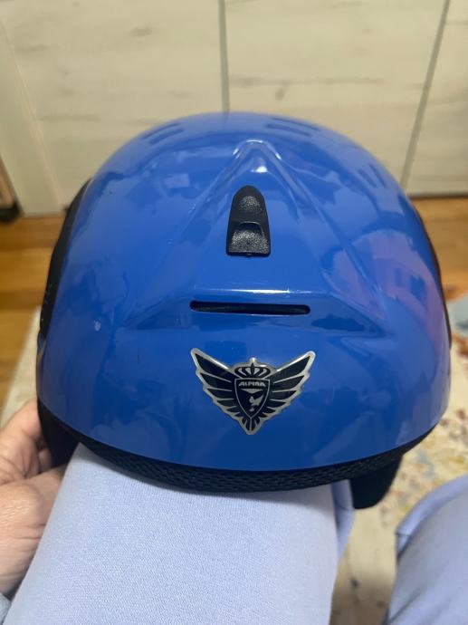 Dječja kaciga Alpina za dječaka ili djevojčicu, odlično očuvana, Može i za odraslu osobu, Podešava se iza na tjemenu i kopče ispod brade. veličina 56 - 61. Ima držač za skijaške naočale na stražnjem dijelu