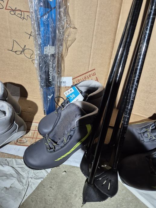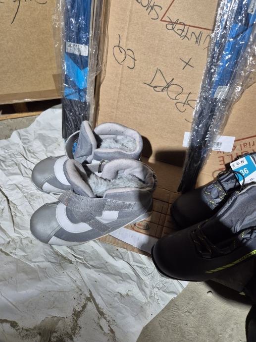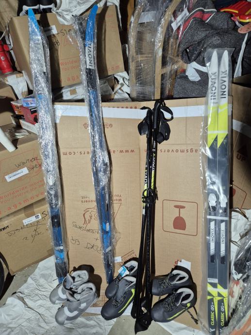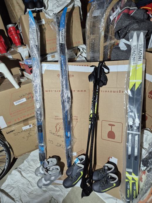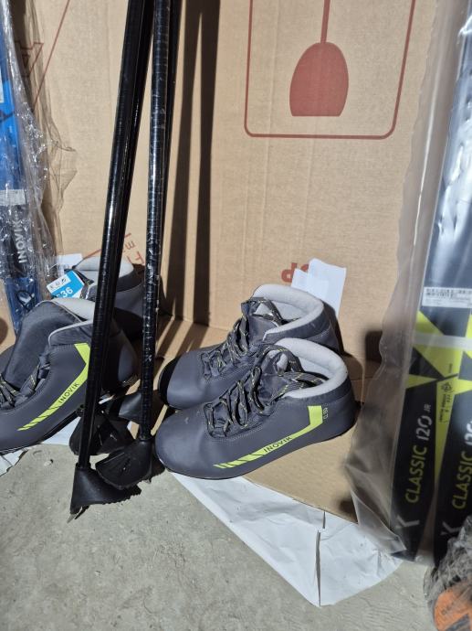 Klasične dječje skije za trčanje s 3 Rotefella veza. Dvije veće (145cm) korištene su 3 puta, manja (137cm) je potpuno nova. 2 para cipela 36 i 1 par 37 cipela. 2 para stapovi od 110 cm.