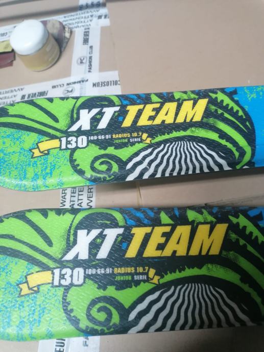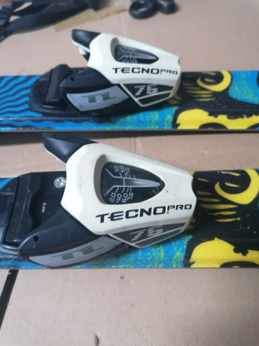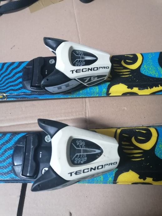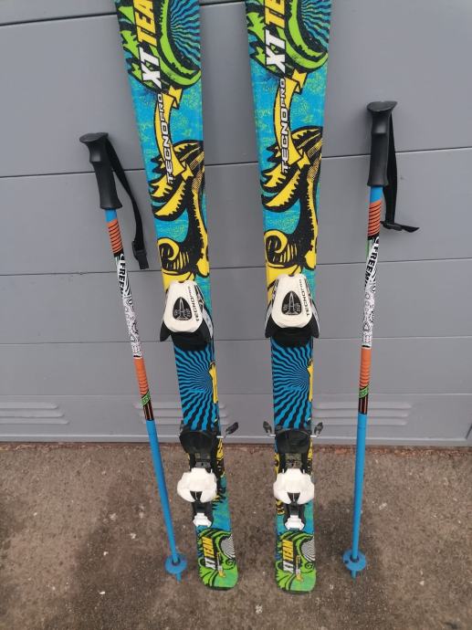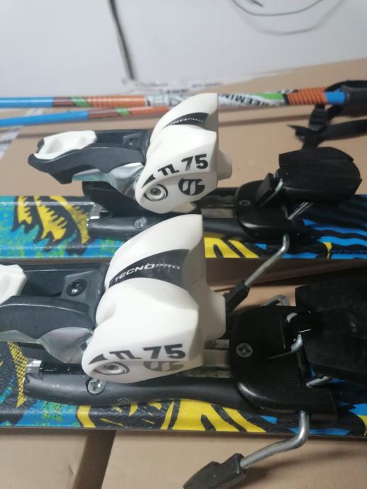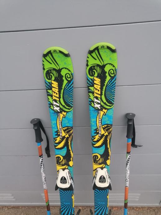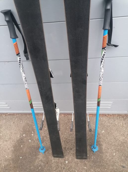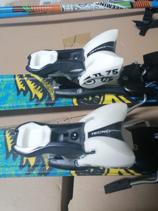 Dječije skije 130 cm sa vezovima i štapovima. Vezovi su sa kočnicom. Štapovi su 100 cm.