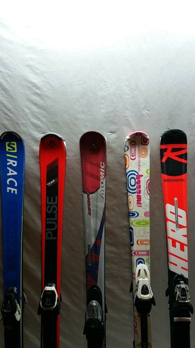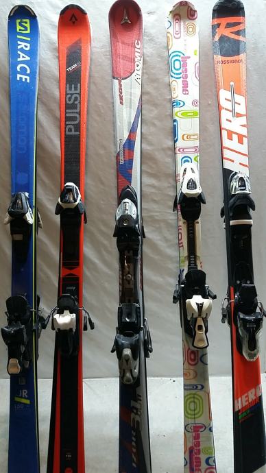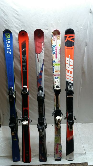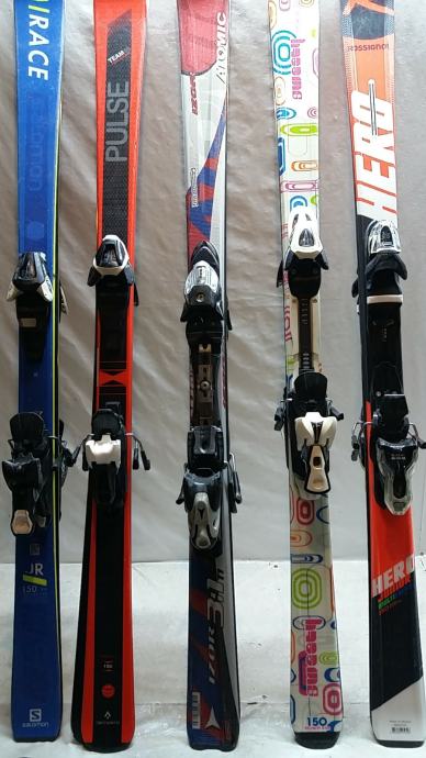 Skije s vezovima, 150 cm, u dobrom stanju, servisirane i spremne za sezonu. S lijeva na desno: 1. 90€, 2. 100€, 3. 120€, 4. 120€, 5. 120€. Moguće u kompletu s pancericama, štapovima i kacigom. Pogledajte i druge moje oglase. Moguće slanje poštom.