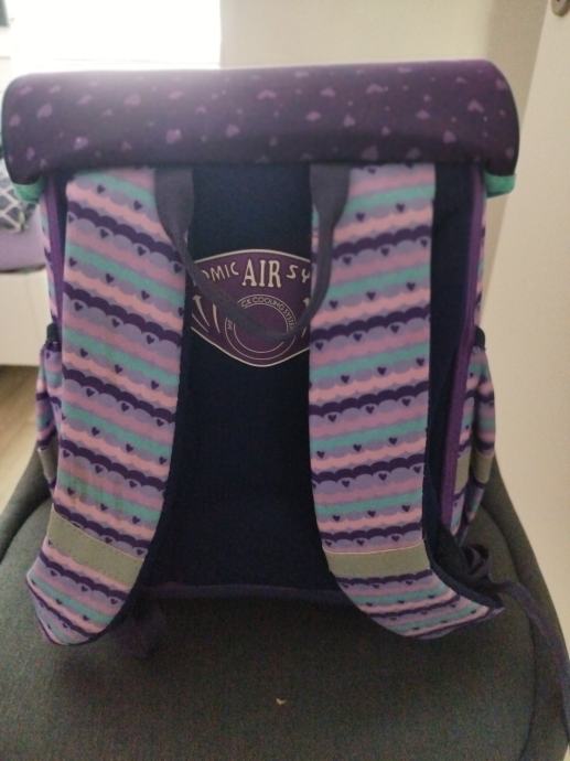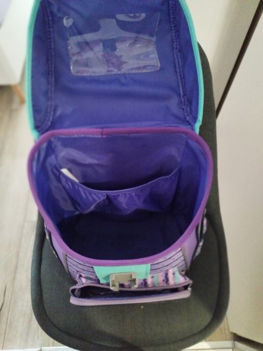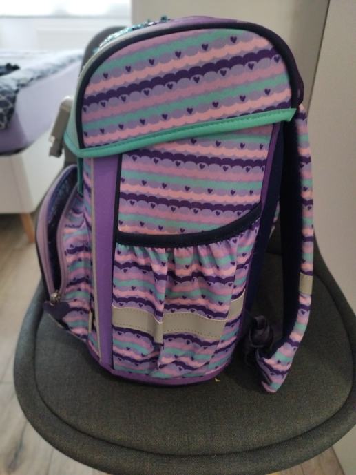 Prodajem školsku torbu, korištena jednu školsku godinu, ali izvrsno očuvana. Lagana, podebljana stražnja strana i naramenice za udobnije nošenje. Srce od šljokica može mijenjati boju. Prednji pretinac izoliran, za užinu. Dva džepa sa strane. Na dnu su čepovi da se ne oštećuje kad je na podu.