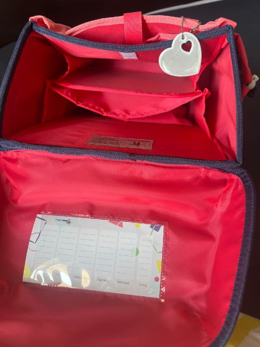 Torba ima prostrane unutarnje pretince s pametno podijeljenim odjeljcima, omogućujući djeci lako organiziranje školskog pribora. Tu su i bočni džepovi za bocu vode i kišobran, kao i prednji džep za pernicu ili kutiju za ručak. Dodatno, postoji odjeljak za mobilni telefon i manje predmete poput karata i ključeva.