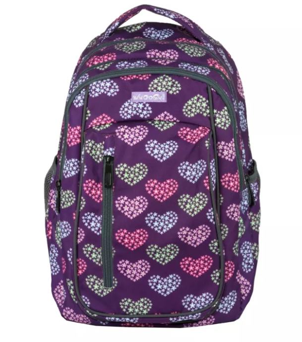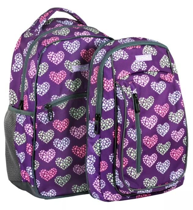 Dva ruksaka spojena zipom u jedan, četiri pretinca za knjige i pretinac za pribor te dva mrežasta džepa sa strane ruksaka