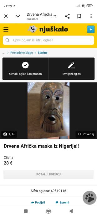 FIGURA vjerojatno iz Nigerije,a prikazuje zenu sa izduženim vratom i kopljem,duga 30 cm.Pošto mi je Djed radio u Nigeriji i Kongu siguran sam da je figura iz jedne od te dvije Afričke države,a mislim da je iz Nigerije 90% . ZA sve informacije nazovite na broj tel 097-6601365 ili pošaljite upit na Viber ili Njuskalo, a Šaljem Poštom ili Tiskom ili u dogovoru sa kupcem.Figura je u odličnom stanju, idealna za policu kuce ili vikendicu,etno imanje , cafe bar, klet ili gdje vec kome pase. Također imam i Afričku masku vjerojatno isto iz Nigerije ali u drugom oglasu pa ako netko kupi oboje i cjena če se korigirati u dogovoru sa kupcem ,masku možete vidjeti u slikama i u drugom oglasu,a ovu statuu pogledajte u Slikama!!