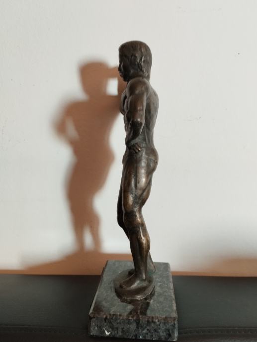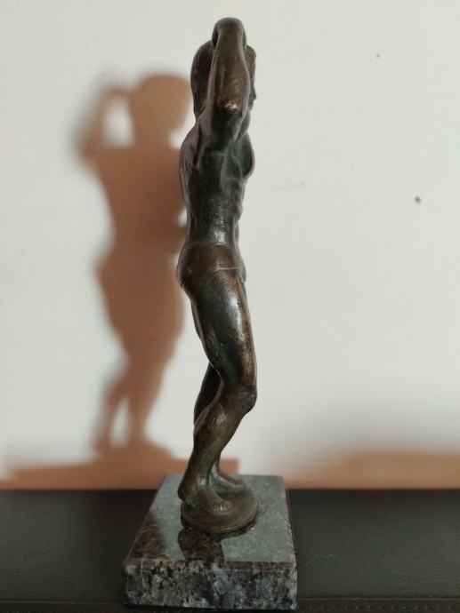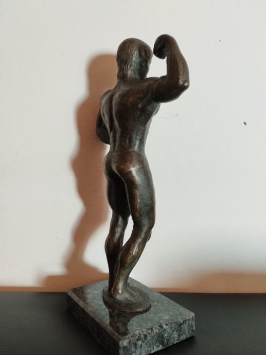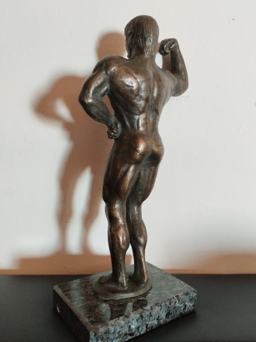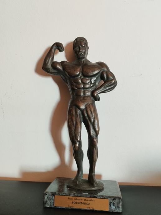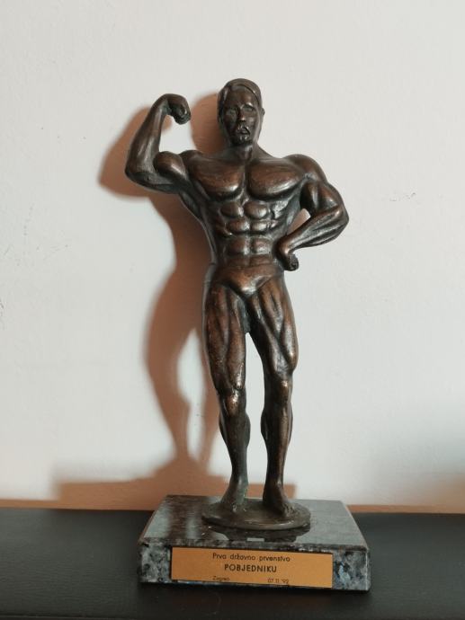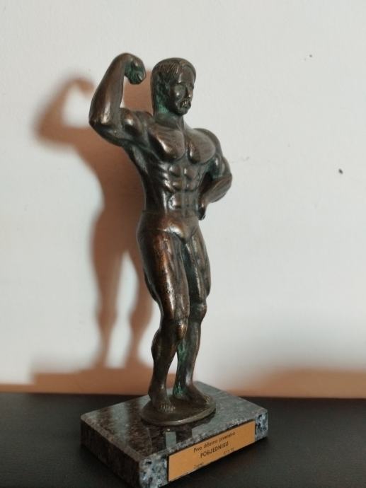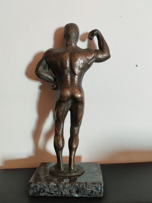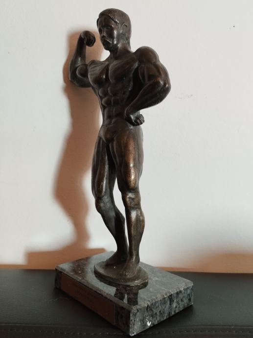 Brončana skulptura (nagrada) s motivom bodybuildera. Puna bronca. Visina s postoljem cca 29cm, težina cca 2,3kg. Mramorno postolje.
