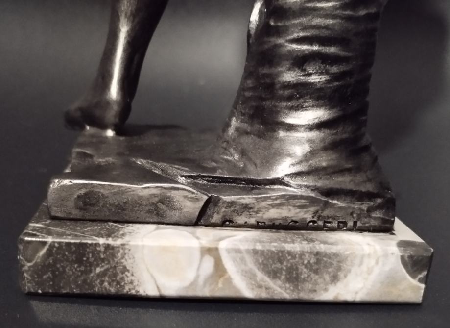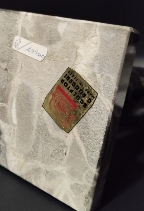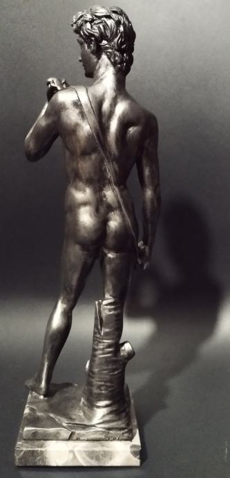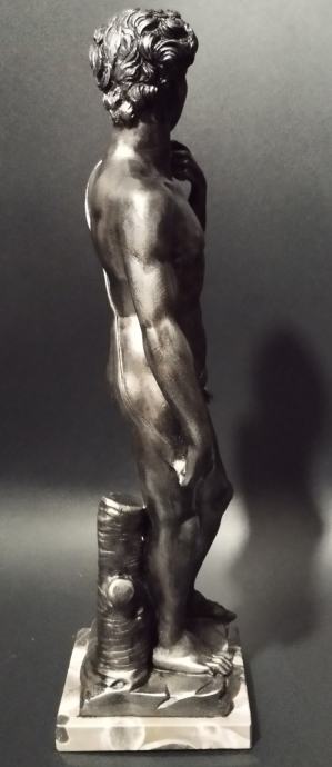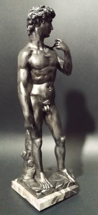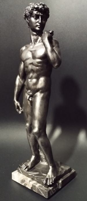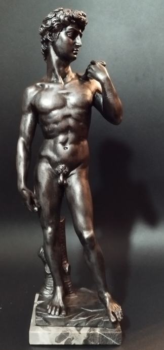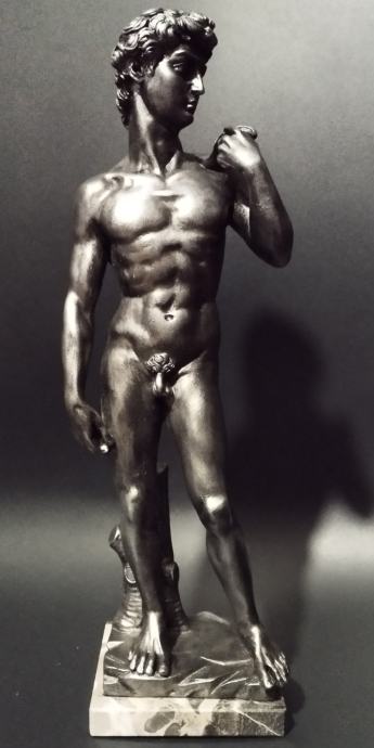 Replika najpoznatije renesansne skulpture. Model za repliku izradio Gino Ruggeri, čuveni talijanski kipar (potpis urezan u dno skulpture i naveden na naljepnici na dnu). Made in Italy. Materijal kamena plastika (ili nešto slično), obojana i patinirana. Visina s mramornim postoljem 30cm.