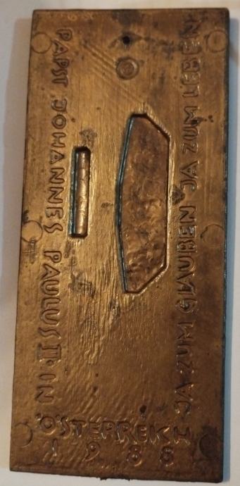 2. Madona s djetetom (veća), brončani reljef izrađen povodom posjete pape Ivana Pavla II Austriji 1988. Dimenzije 7,3 cm x 16,5 cm.