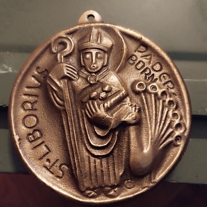 Brončani reljef / plaketa (St. Liborius - sveti Liberan) promjera cca 9cm iz čuvene njemačke crkvene radionice Cassau u Paderbornu.
