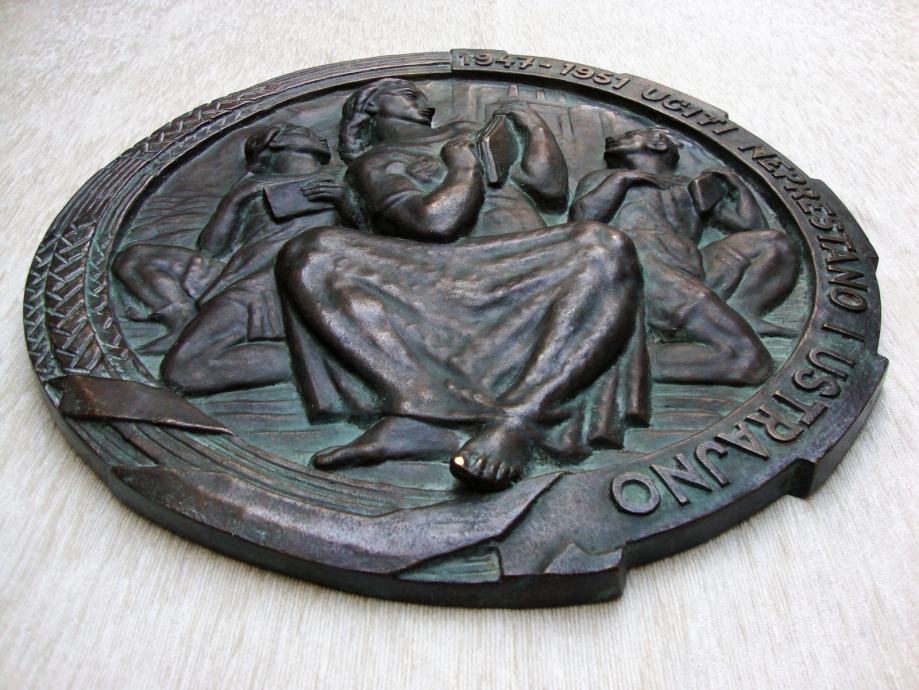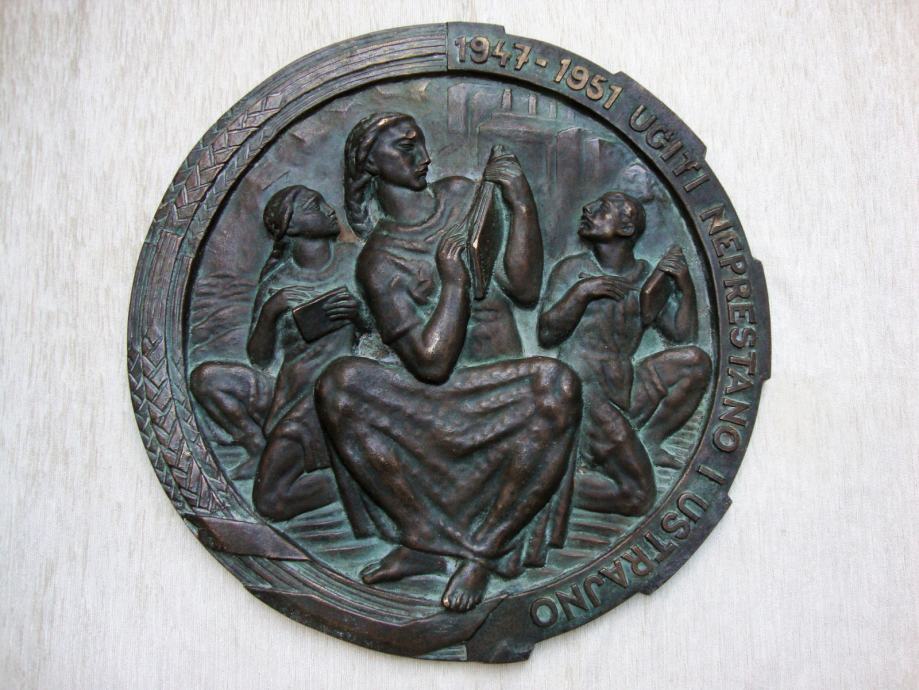 Reljefna velika zidna skulptura izrađena za vrijeme socijalizma natpis 1947-1951 UĆITI NEPRESTANO I USTRAJANO